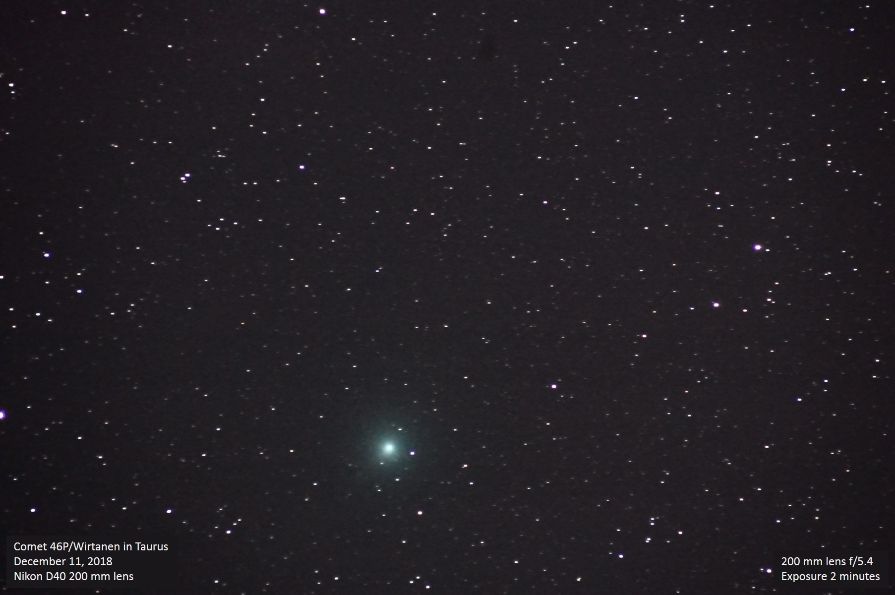 Comet 46P/Wirtanen is a relatively small comet with an orbital period in our solar system of about 5.5 years. During the latter part of 2018 and the first month of 2019, it came through our inner solar system and was close enough to Earth to become fairly bright, and unmistakable owing to the signature green color. According to the Wikipedia article on it, the comet attained greatest brightness of around +3.9, which is easily within range of the unaided eye. From this finder chart, we see that Wirtanen was located in the southwestern corner of Taurus on this evening, with a trajectory to the north-northeast. Unannotated image |