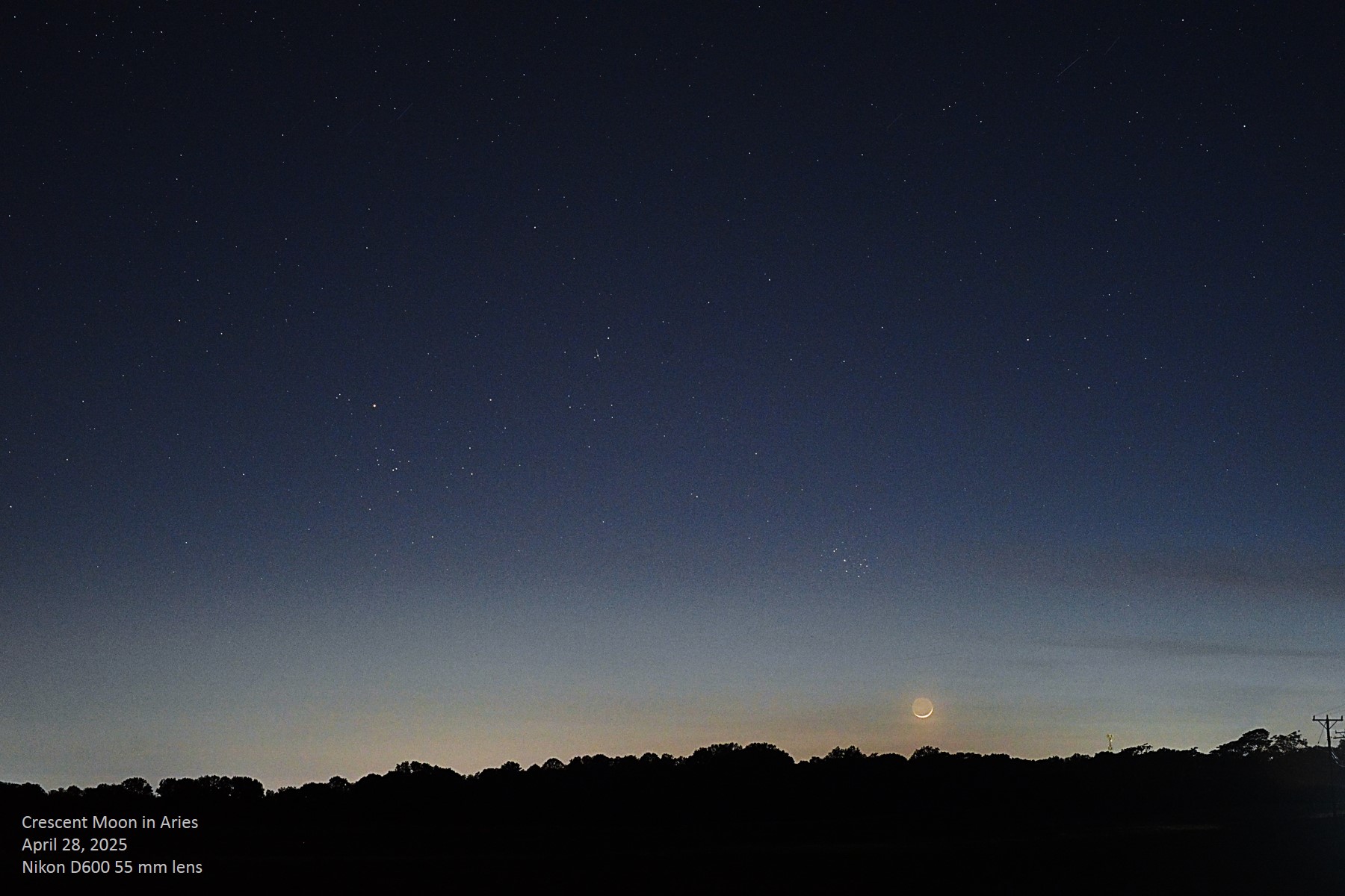 The two day old crescent Moon hugs the horizon in Aries, only several hours away from moving into Taurus on its way to a rendezvous with Jupiter in two days. Unannotated image.
