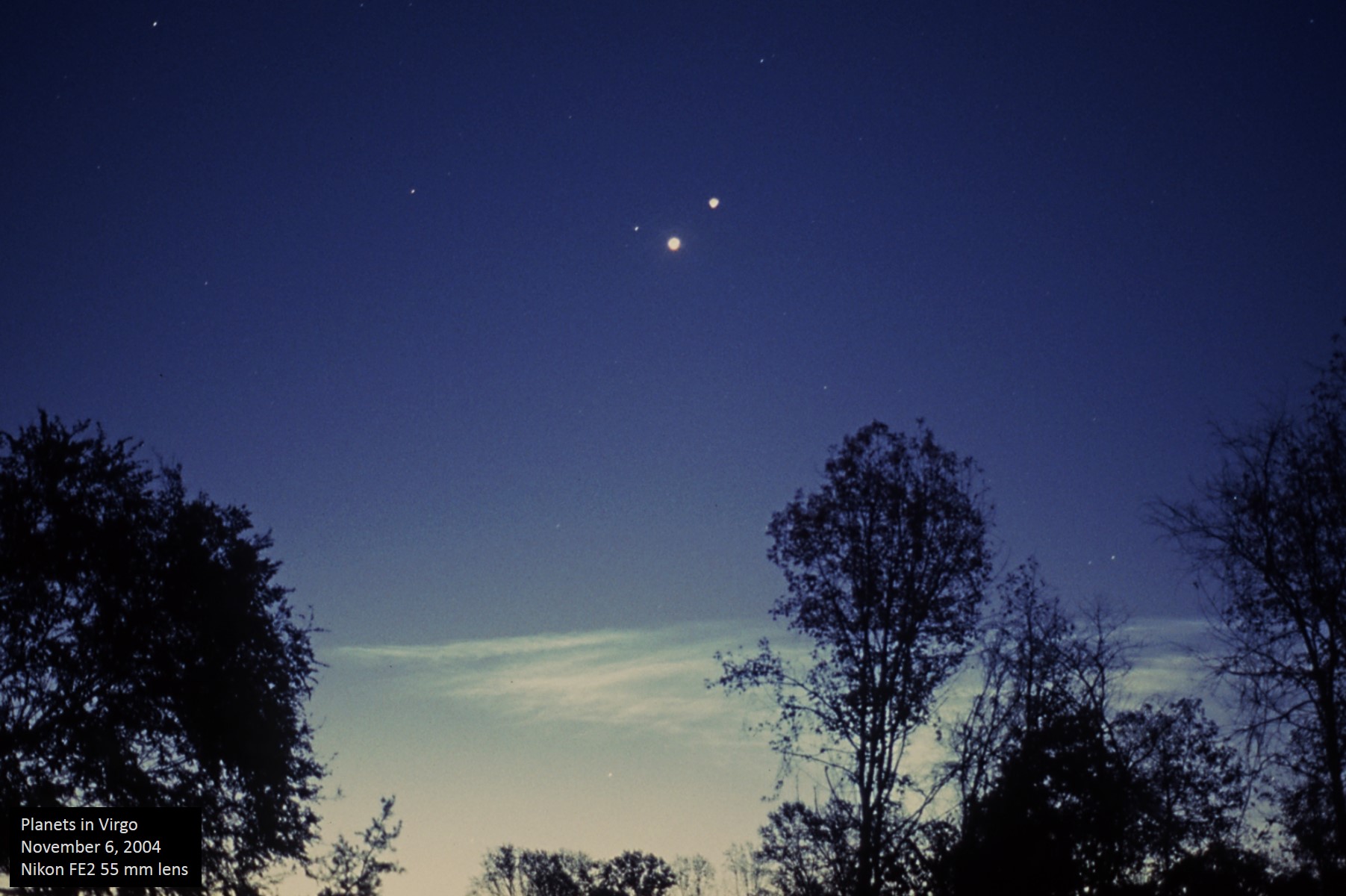 Venus and Jupiter had a very nice conjunction on November 5, 2004 in central Virgo. The closest the two would get during this conjunction was about 32'51" apart, a little more than 1/2°, but this would have only been visible from the Middle East, or anywhere on Earth near the longitude of the Caspian Sea, Black Sea, or Persian Gulf. From the eastern United States, the separation between them on November 5 was 39'22", however on the morning of November 6, the gap had grown to 1°29'18". This conjunction mirrored a similar one in 1980 and will be succeeded by one on November 10, 2028. Mars is also barely visible in bright twilight lower left of Spica. Unannotated image. |