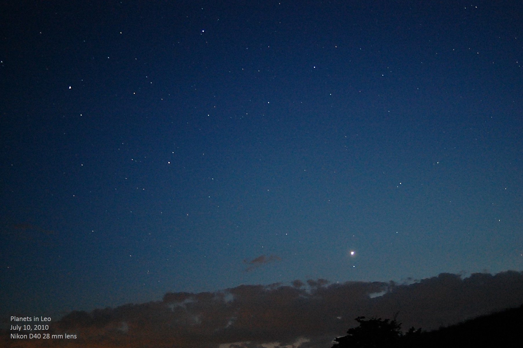 In July 2010, we are seeing the beginning of an interesting planetary gathering as Mars rapidly gains on Saturn, while Venus even more rapidly gains on both of them. On this date, Venus has just passed Regulus, Mars has just drawn even with σ Leonis, and Saturn is between β and η Virginis. Venus is magnitude -4.09, Mars is +1.40, and Saturn is +1.09. The photo was taken with a Nikon D40 and 28 mm lens, which yields an image scale that equates to a 42 mm lens with a full frame camera. Unannotated image |