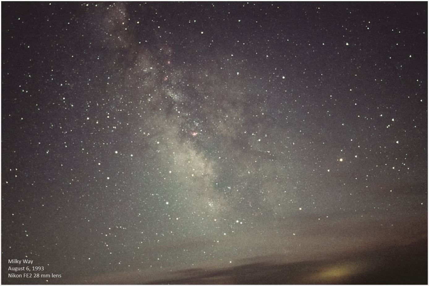In August of 1993, I bought a used 55mm f/1.2 Nikkor lens at a camera shop in Boulder, Colorado and of course tried it out for some wide-field astrophotography. I drove out to a location in the mountains of central Colorado near the town of Fairplay and got several nice images, but then also took this picture of the summer Milky Way with a 28 mm wide angle lens ~ the tracking and polar alignment must have been pretty good given the lack of distortion in the corners. The only objectionable aspect here is the purple color of the sky ~ I must have been using Ektachrome 400 at the time! Unannotated image, Back | |