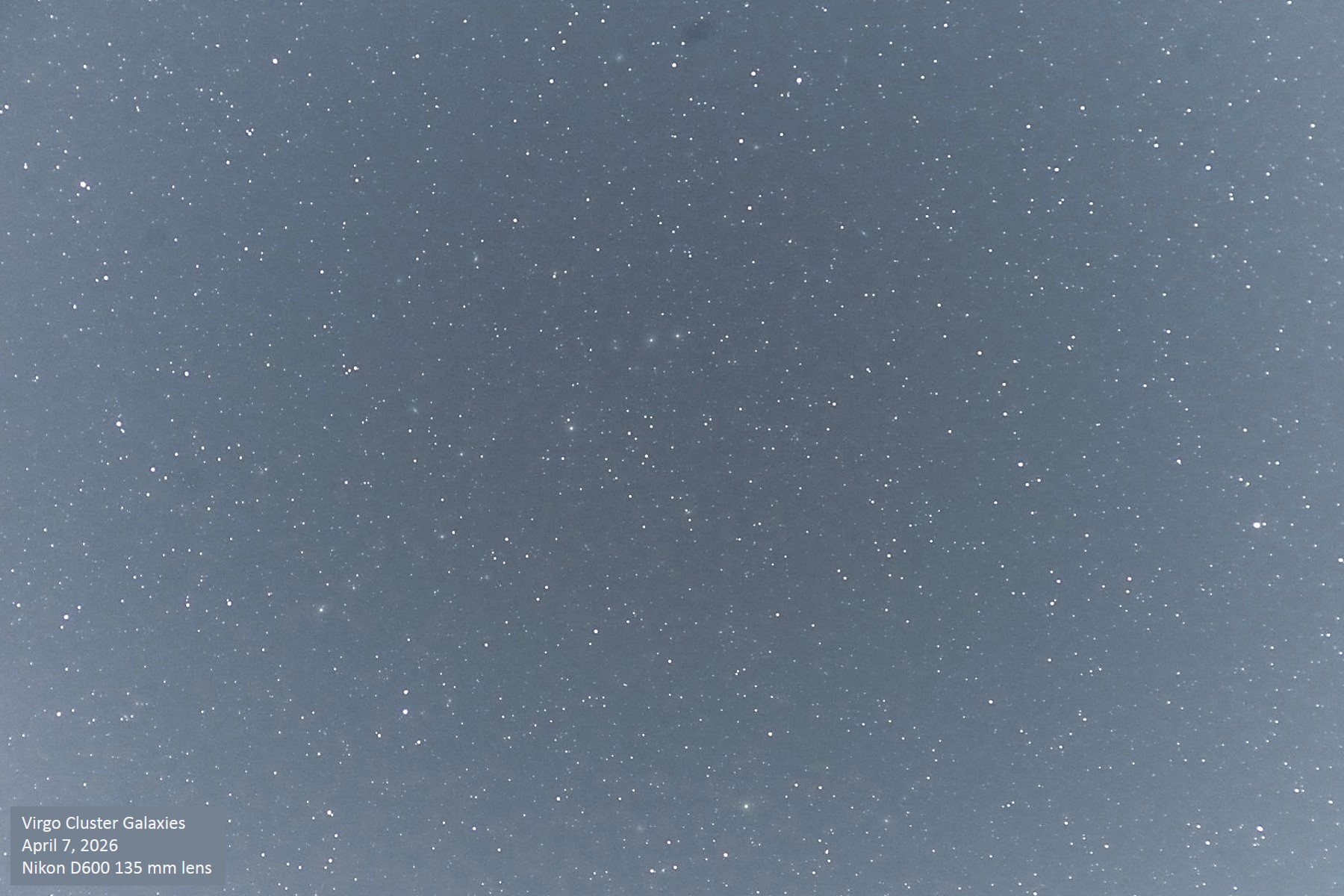 I've always wanted a good wide-field image of the central portion of the Virgo cluster of galaxies. All of the Messier galaxies in Virgo are annotated along with many of the NGC galaxies. Based on their appearance on the image, observers with even modest equipment could try for NGC 4216, 4568, 4365, 4526, 4535, and 4596. My image is a result of stacking and pretty severe contrast and brightness enhancements, so it's very noisy ~ here is an instance of one of the individual images. Unannotated view. |