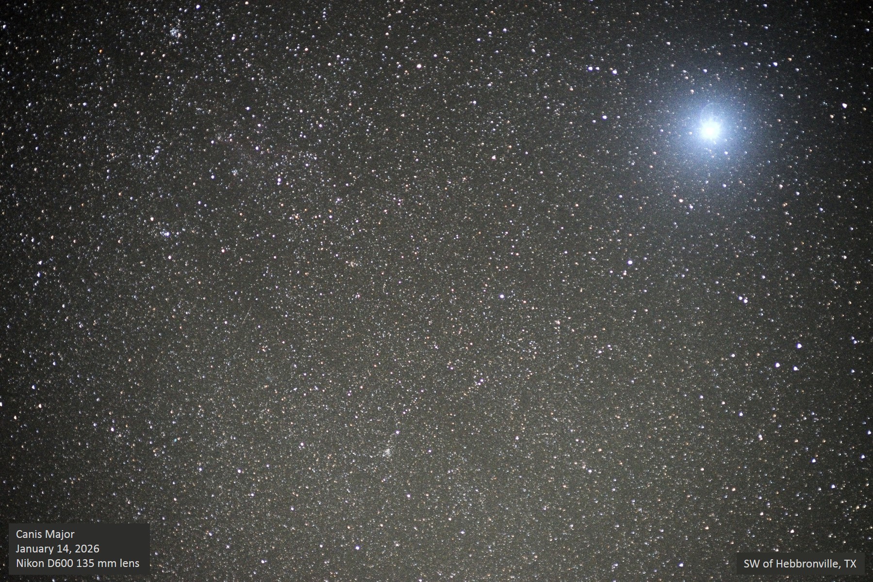 The area of northeastern Canis Major is rich in open clusters, so in this view, we see Sirius at upper right, and the clusters northeast of it as well as the clusters in southern Monoceros. For observers of nebulae, the chart also locates two great winter objects, namely the Seagull Nebula, IC 2177, as well as NGC 2359, the planetary known as Thor's Helmet. They don't register on the image but their relationship to the surrounding clusters is still clear. I spent time hunting down a possible comet that appears on the image, exactly the green color of many comets, between the clusters NGC 2374 and NGC 2396, but despite its appearance I think it is just a hot pixel LOL. From the image, NGC 2360 and NGC 2353 seem like great targets. Unannotated image. |