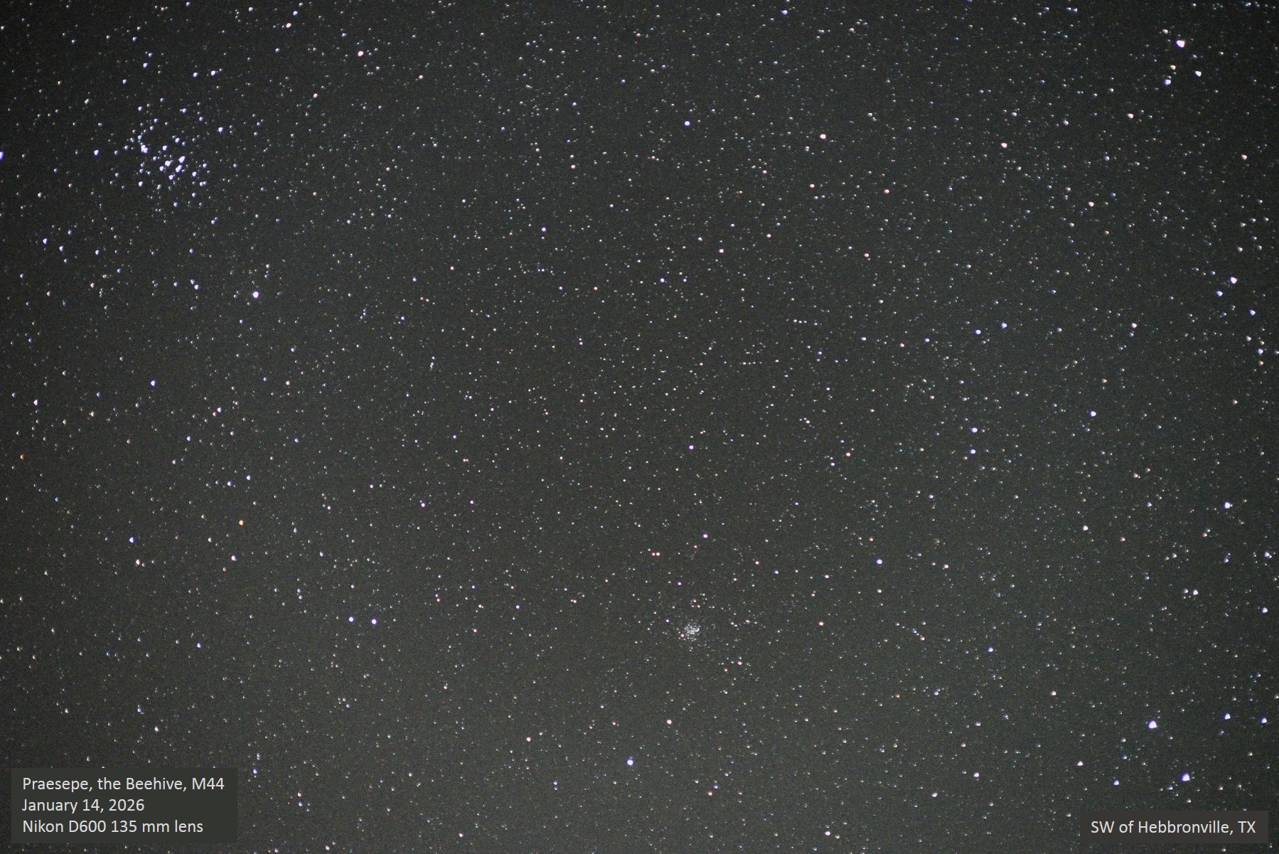 Southern Cancer is shown in this image, ranging from the Beehive Cluster at upper left down to the border with Hydra, with special emphasis on the open cluster M67 at bottom center. From this 135 mm image, we can see that M67 is a large and concentrated cluster very rich in stars, most of which are of moderate and relatively equal brightness. Unannotated image. |