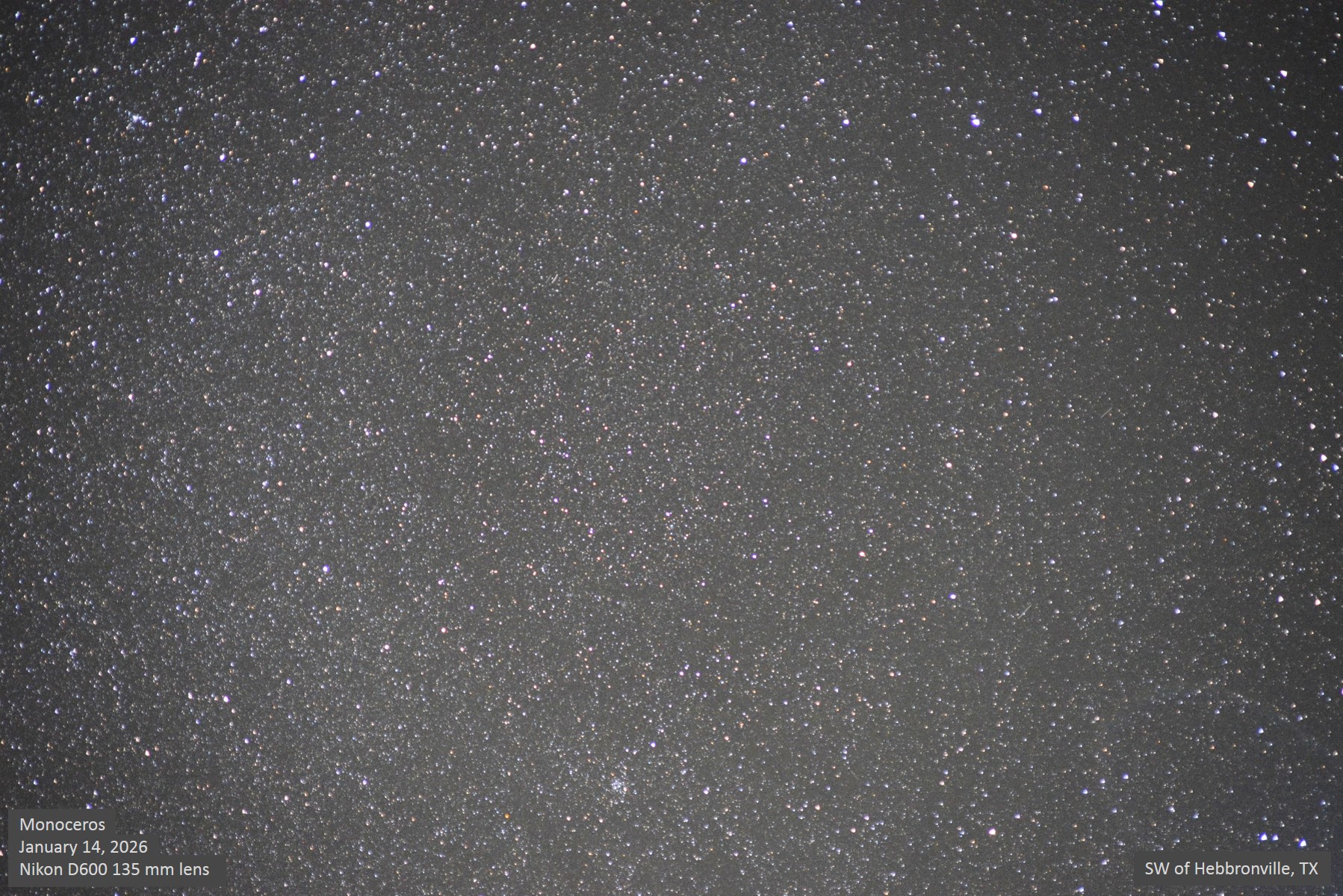 This image is centered on the south central portion of Monoceros, which means we are looking along the galactic equator in the area north of Sirius. The main object in this field is M50, and north of it we see six additional open clusters. The contrasts are striking ~ in some cases such as NGC 2301, we see a splashy cluster dominated by relatively few bright stars, while in other cases such as NGC 2311, the stars are relatively dim but more numerous and located near the nebula Sharpless 2-287. Another example of this style of cluster is NGC 2286. This area is definitely worth scanning with large binoculars or small telescope. Unannotated image. |