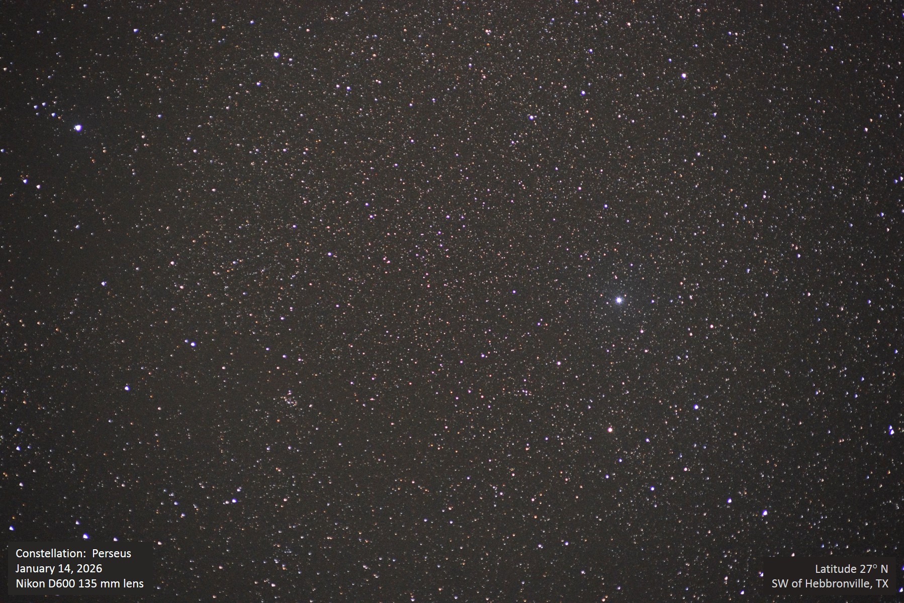Here we are looking in the direction of southern Perseus, focused on the showy open cluster NGC 1342. This object is sometimes called the little scorpion because of its resemblance to the outline of that constellation. It is also referred to sometimes as the Stingray Cluster. Whatever moniker you elect to use for it, it makes an excellent target for large binoculars or small telescopes. My image cuts off the California Nebula from the left edge of the frame, so without that, there are no other visible deep sky objects visible on this image. Unannotated image. |