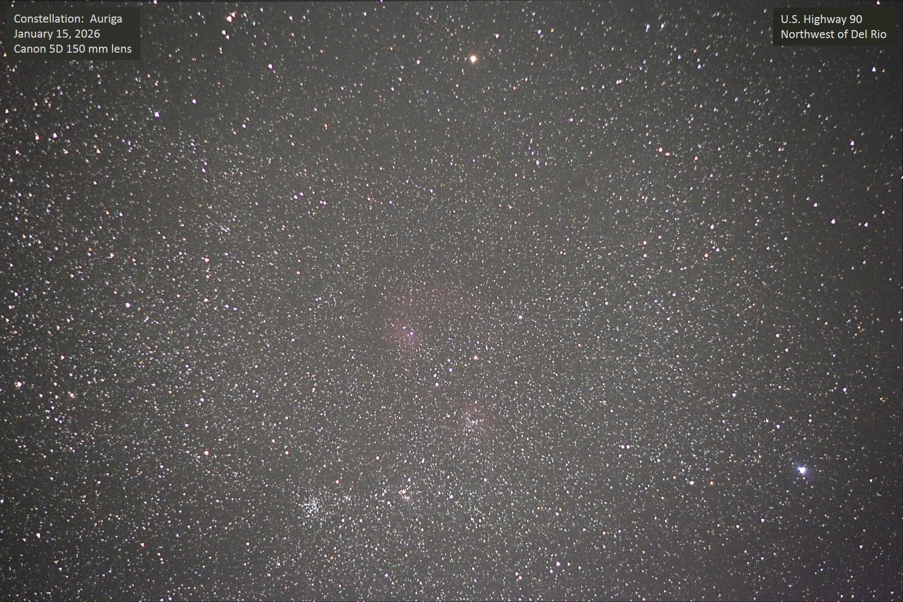 With my modified Canon 5D camera and a 150 mm lens, I attempted to record the reddish emission nebulae in the center of Auriga, known as IC 405 and IC 410. In this view from a dark location astride U.S. 90 northwest of Del Rio, near the Mexican border, we are looking at M38, NGC 1907, and faint representations of the two emission regions. The bright star at lower right is Elnath, or β Tauri. This image resulted from a single 30 second exposure. Unannotated image. |