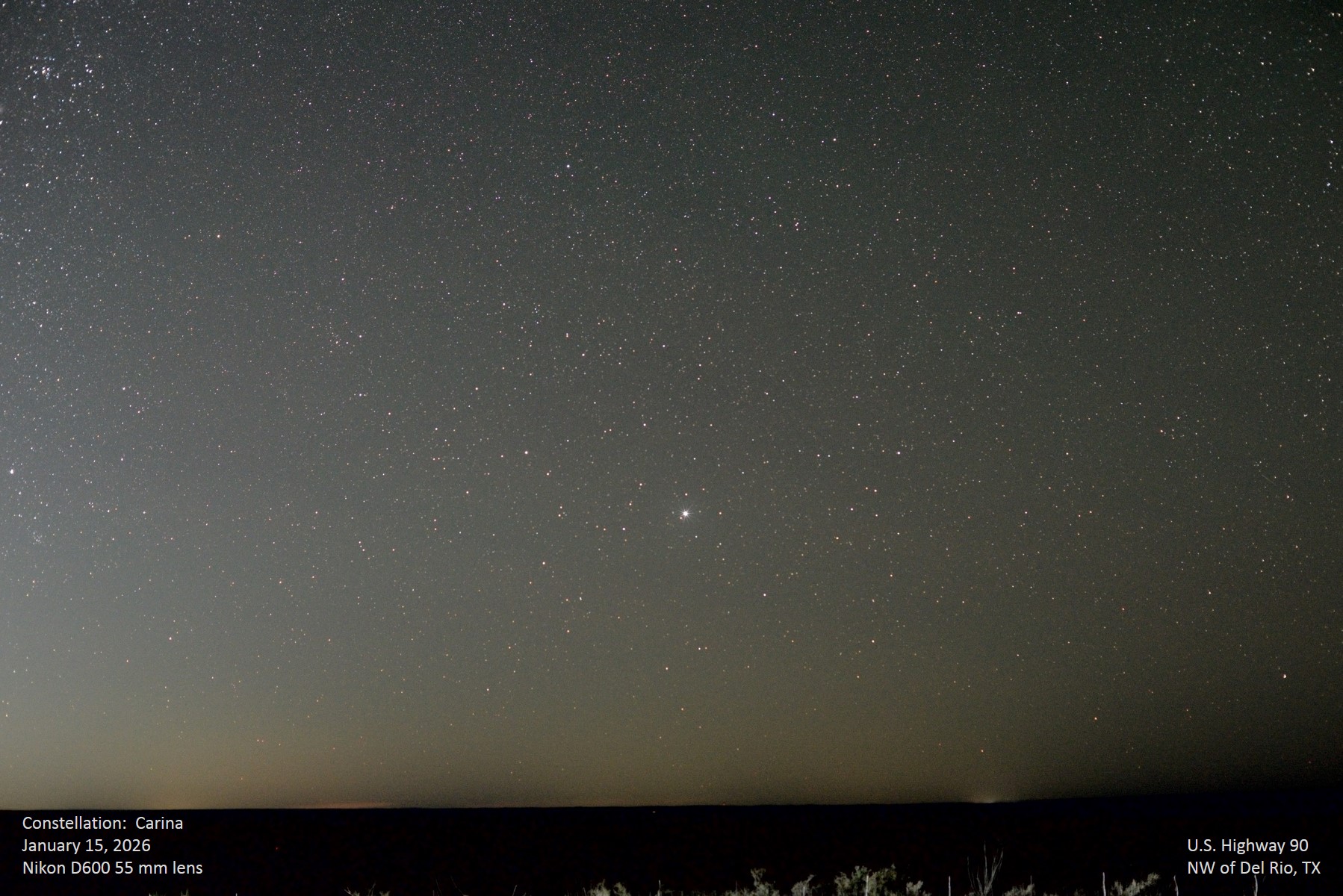 Around midnight between January 15 and 16, I captured the great southern star Canopus low over the horizon from my 29°42' north latitude site. The constellations in this area are rather barren except for the second brightest star. They include Puppis, western Carina, Columba, Pictor, and Dorado. Unannotated image. |