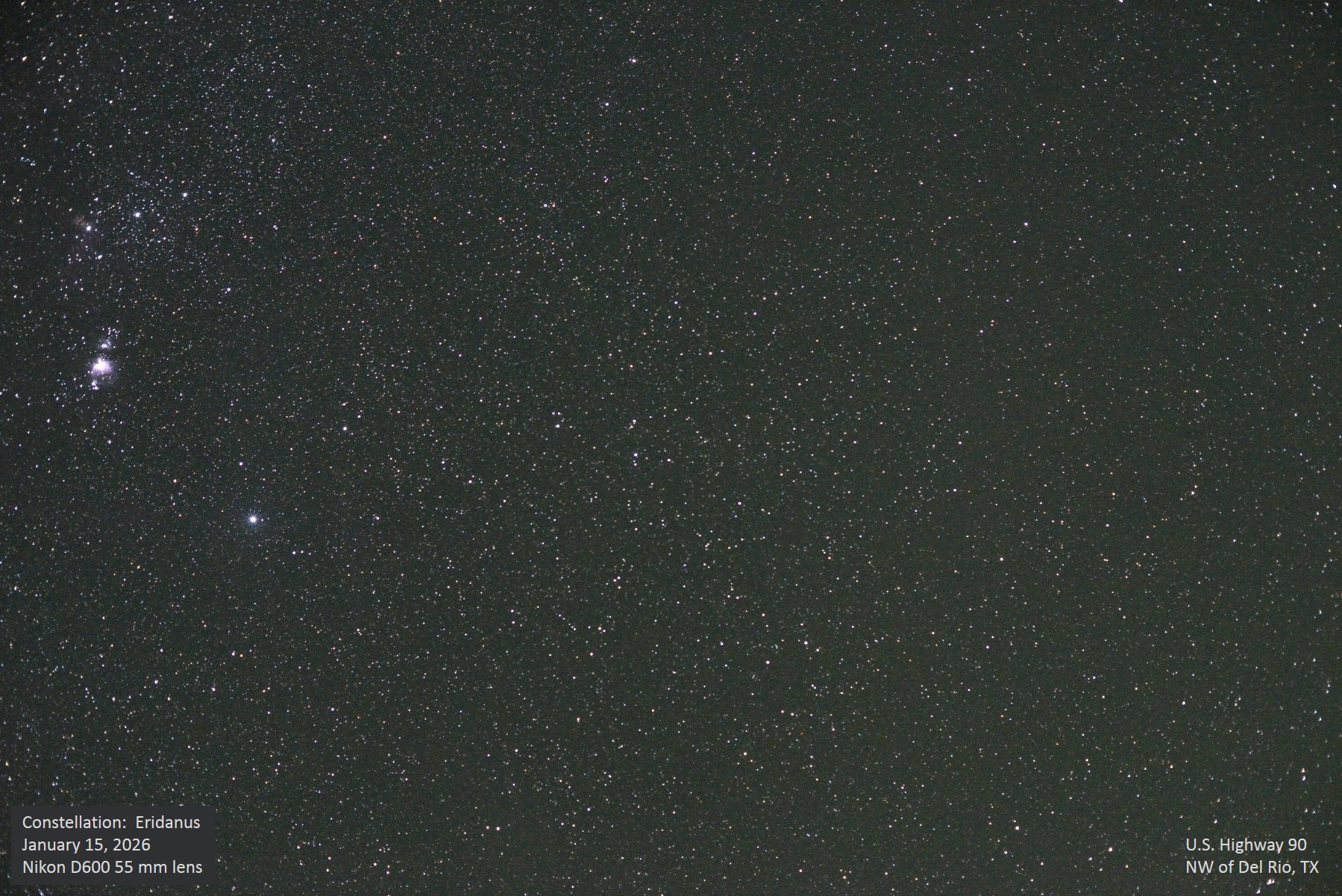 Here we are looking at the northern portion of Eridanus, stretching from Rigel in Orion down to Delta and Epsilon Eridani at lower right. This view includes southwestern Orion and southern Taurus as well as the northwestern corner of Lepus. Although there are numerous galaxies in this part of the constellation, my exposure was not long enough, and my lens not telephoto, to record any of them. Unannotated image. |