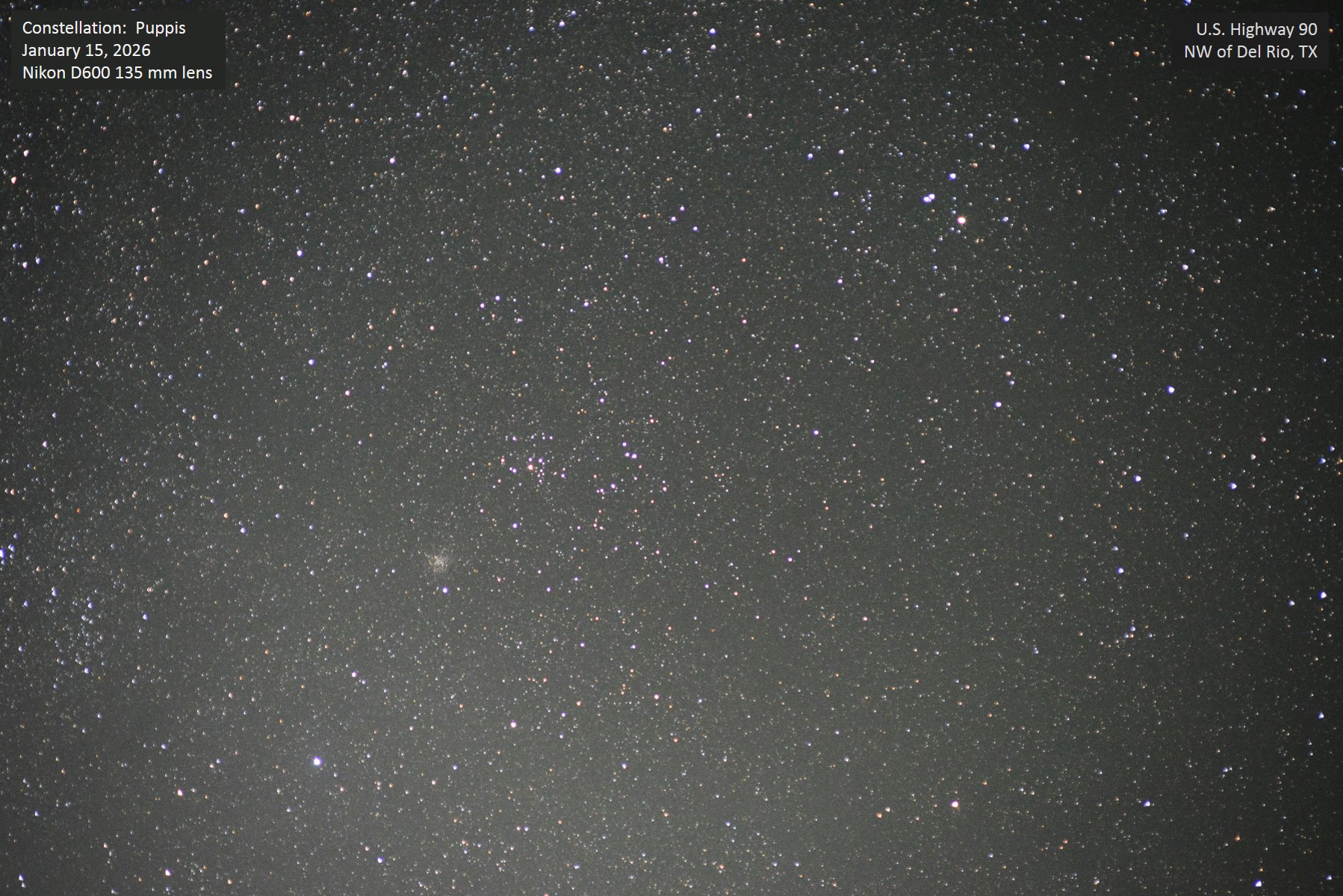 Here we are looking at the southerly constellation of Puppis, focusing on the portion below Canis Major, in particular the right triangle comprising π, σ, and ζ Puppis. Being able to recognize this triangle is the gateway to spotting one of the most extreme contrasts between open cluster types in the sky, even more radical than M46/M47. We are talking about NGC 2451 and NGC 2477, close together along the line from π to ζ. NGC 2451 is extremely loose and sparse, but with a beautiful color contrast between the bright orange star in the middle and the remaining cluster members; NGC 2477 comprises hundreds of uniformly faint stars, creating a nebulous appearance. The difference in appearance is explained by their true size and distance ~ NGC 2477 is about 3,600 light years away and contains at least 300 stars, while NGC 2451 contains dozens of stars in two separate clusters, the nearer being 600 light years distant and the farther one being 1,200 light years away. Unannotated image. |