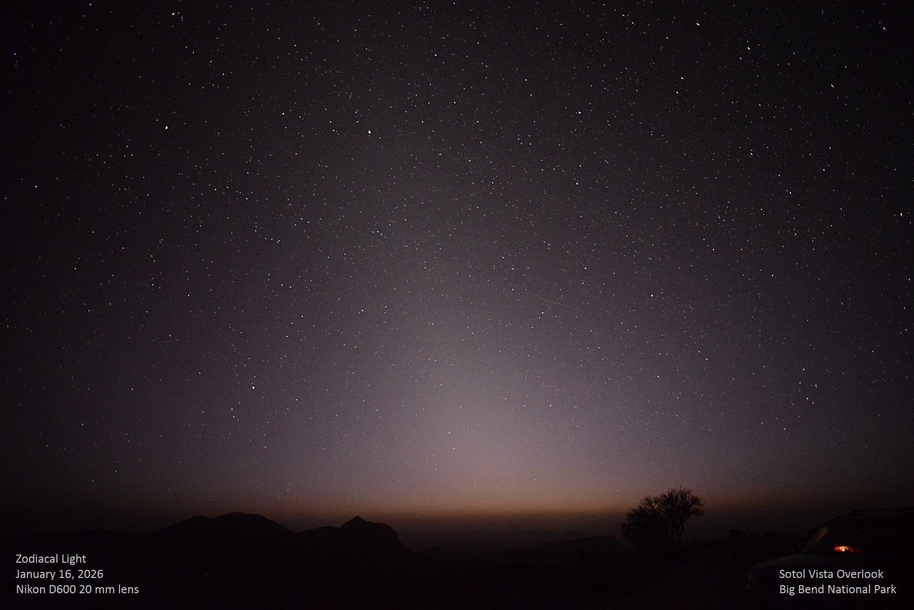 Looking west about 90 minutes or even two hours after sunset from this dark location, the zodiacal light was plain to see. The wide angle lens required to show the entire width of it at its base results in a panorama from Phoenix and Grus on the left to Delphinus and Sagitta on the right. Unannotated image. |