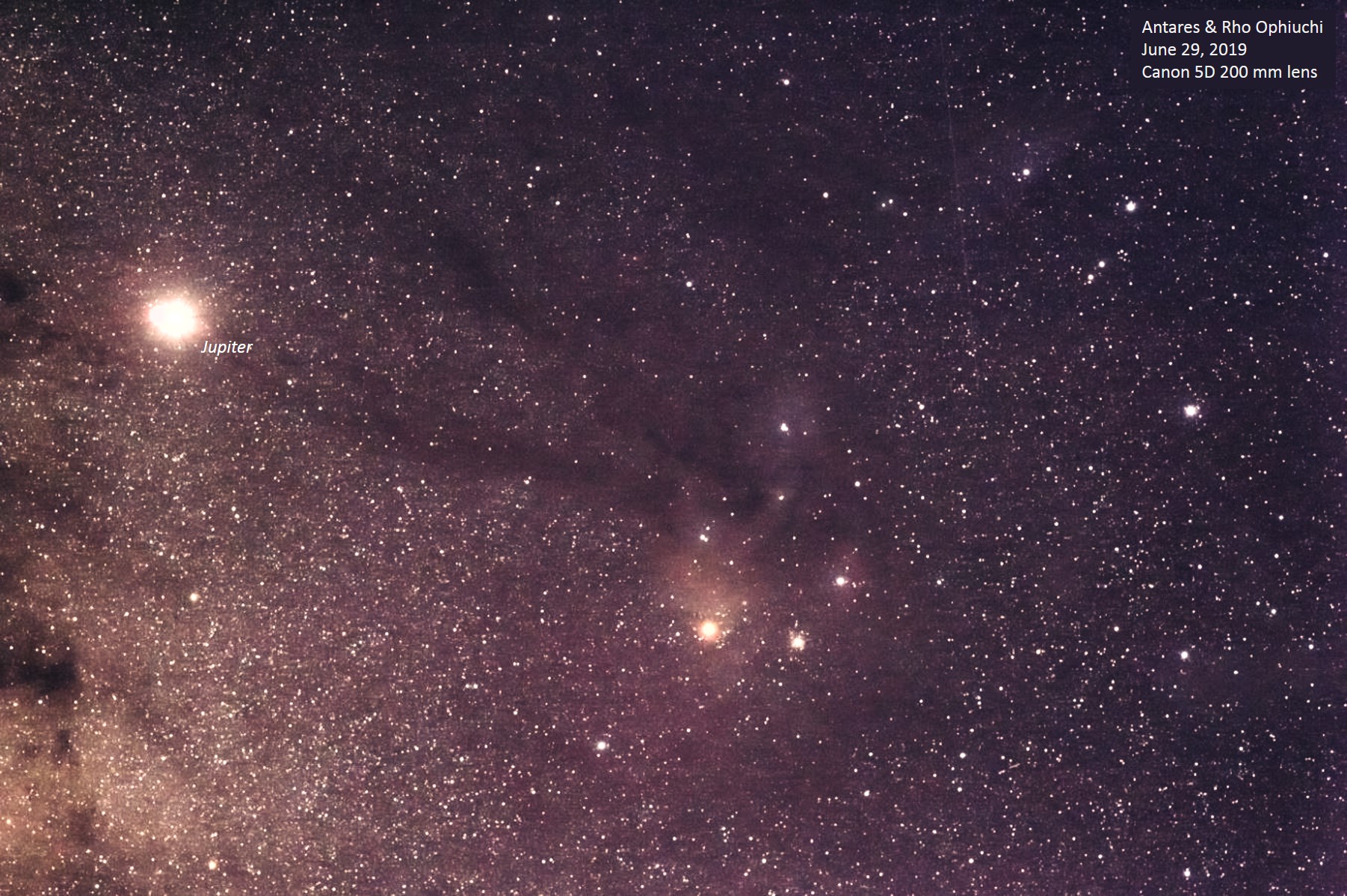 Antares, Rho Ophiuchi, and Jupiter (at left) from Big Bend National Park;
