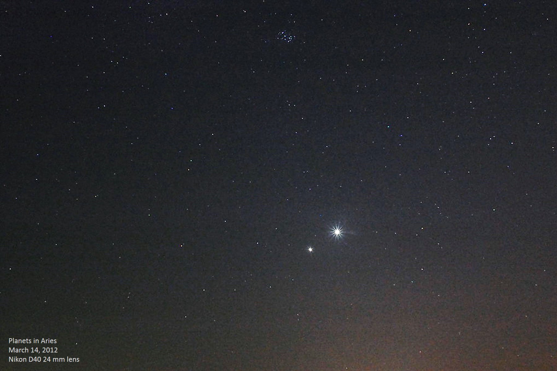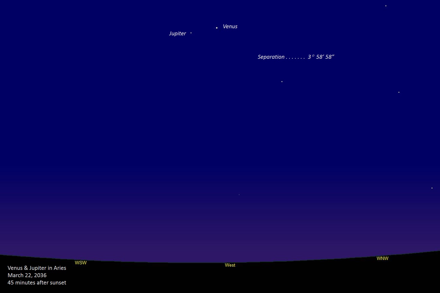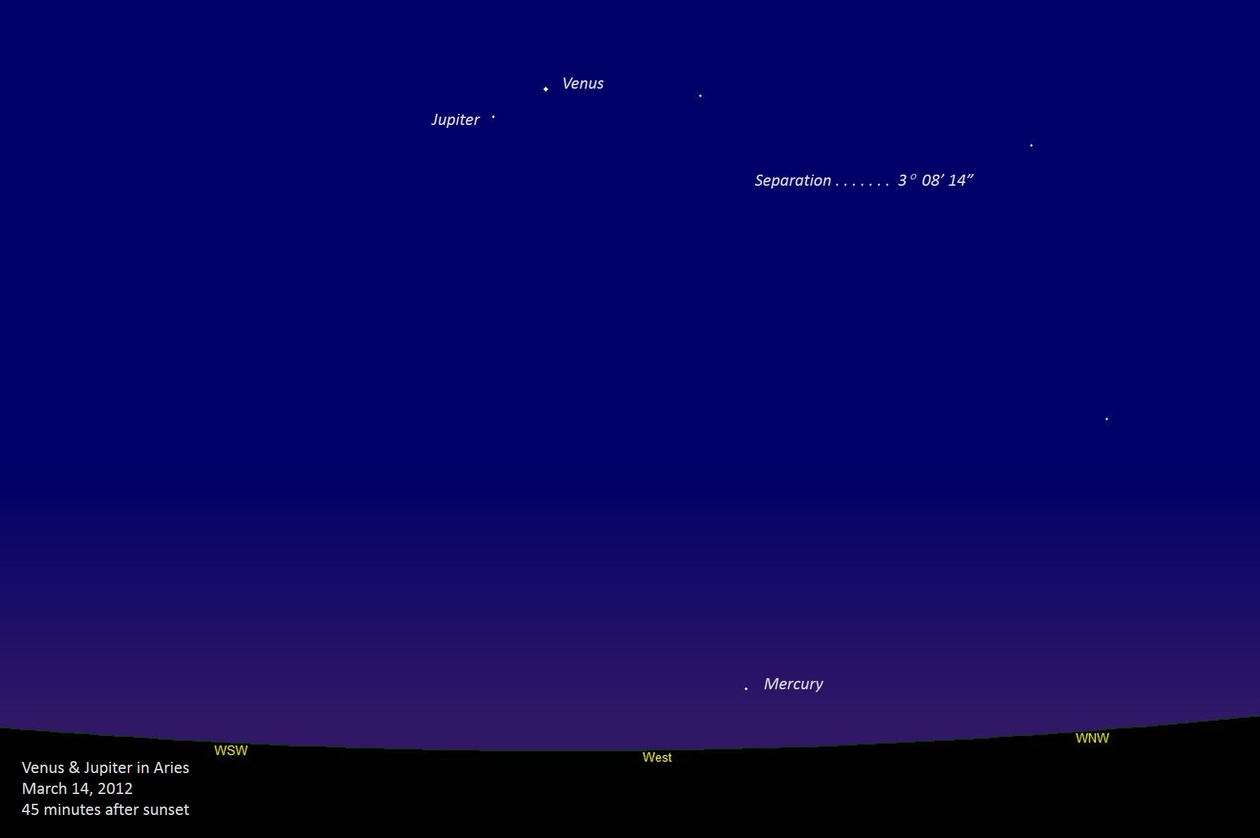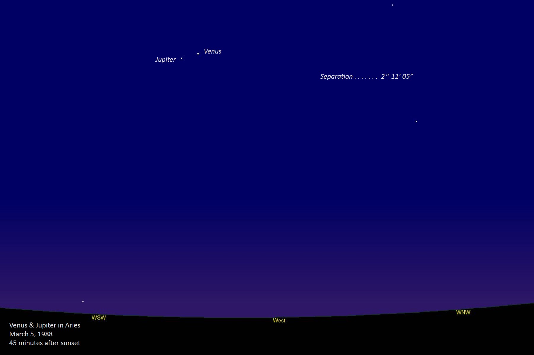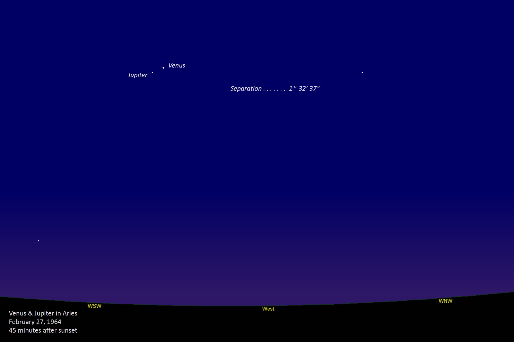 In early 2012, Jupiter was concluding an apparition similar to its 2000 and 1988 apparitions, so moving eastward through Aries; at the same time, Venus was in the midst of one of its best evening apparitions during the course of its eight-year cycle, therefore similar to 2004, 1996, and 1988. Thus, we see that this conjunction of the two brightest planets mirrors that of 1964 and 1988, and will be succeeded by one in 2036. On this evening, Venus is magnitude -4.29 and Jupiter is -2.15, with 3°09'08" separating them. On the right side, we have four diagrams of the conjunctions in this series during my lifetime: 1964 (I was only 1 year old), 1988, 2012, and the next one is 2036 (I will be 73 then). Unannotated image | ||