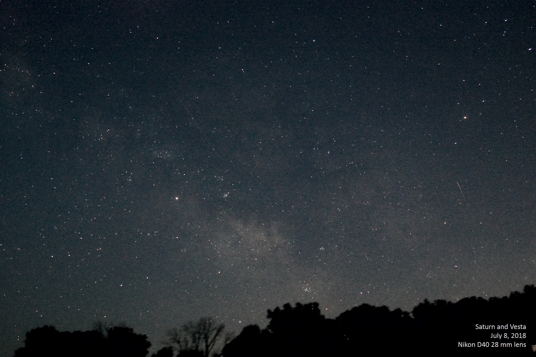 Saturn spent 2018 in the constellation Sagittarius, unusually bright as it always is here because its rings are about as wide open as they can be and therefore offering a greater surface area to reflect light. This evening, Saturn is at magnitude +0.08, while Vesta checks in at magnitude +5.75, by far brighter that any other asteroid, or minor planet, can get. Unannotated image |