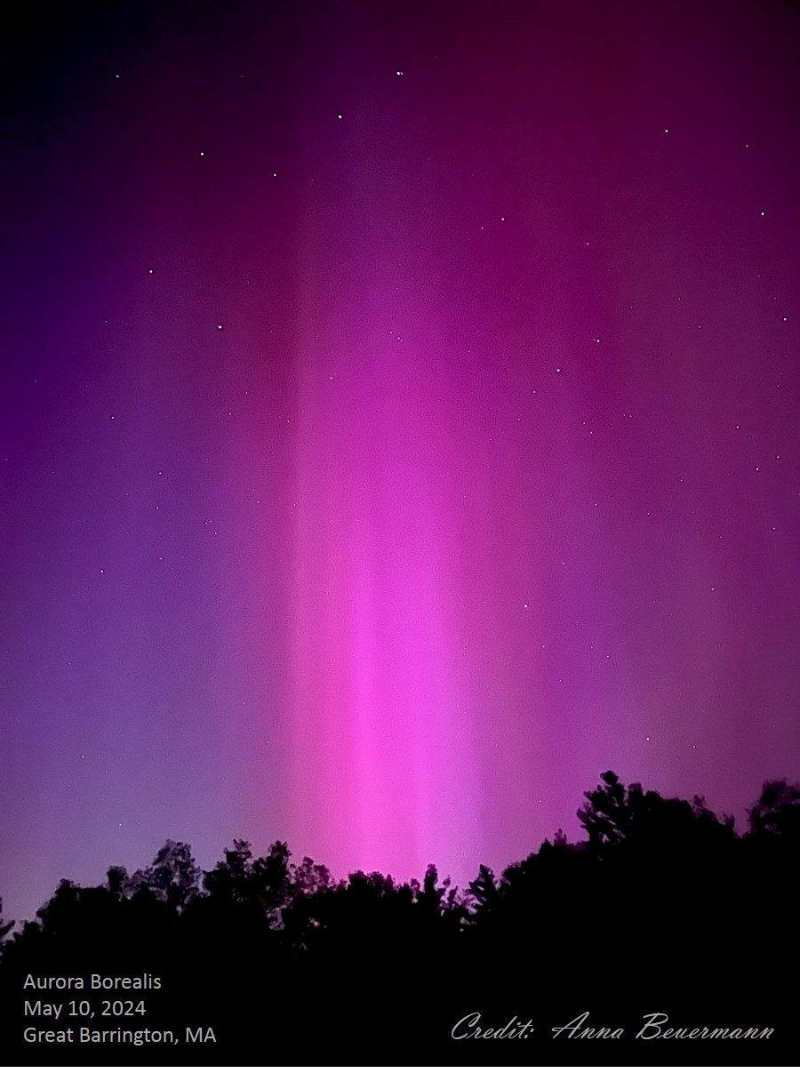 | The aurora borealis was visible across much of the United States on the evening of May 10, 2024; my lady friend Laura's daughter took these pictures from Great Barrington, MA. She reported that the aurora looked mostly gray to the unaided eye; only with her iPhone in night mode was she able to record the vibrant colors. |