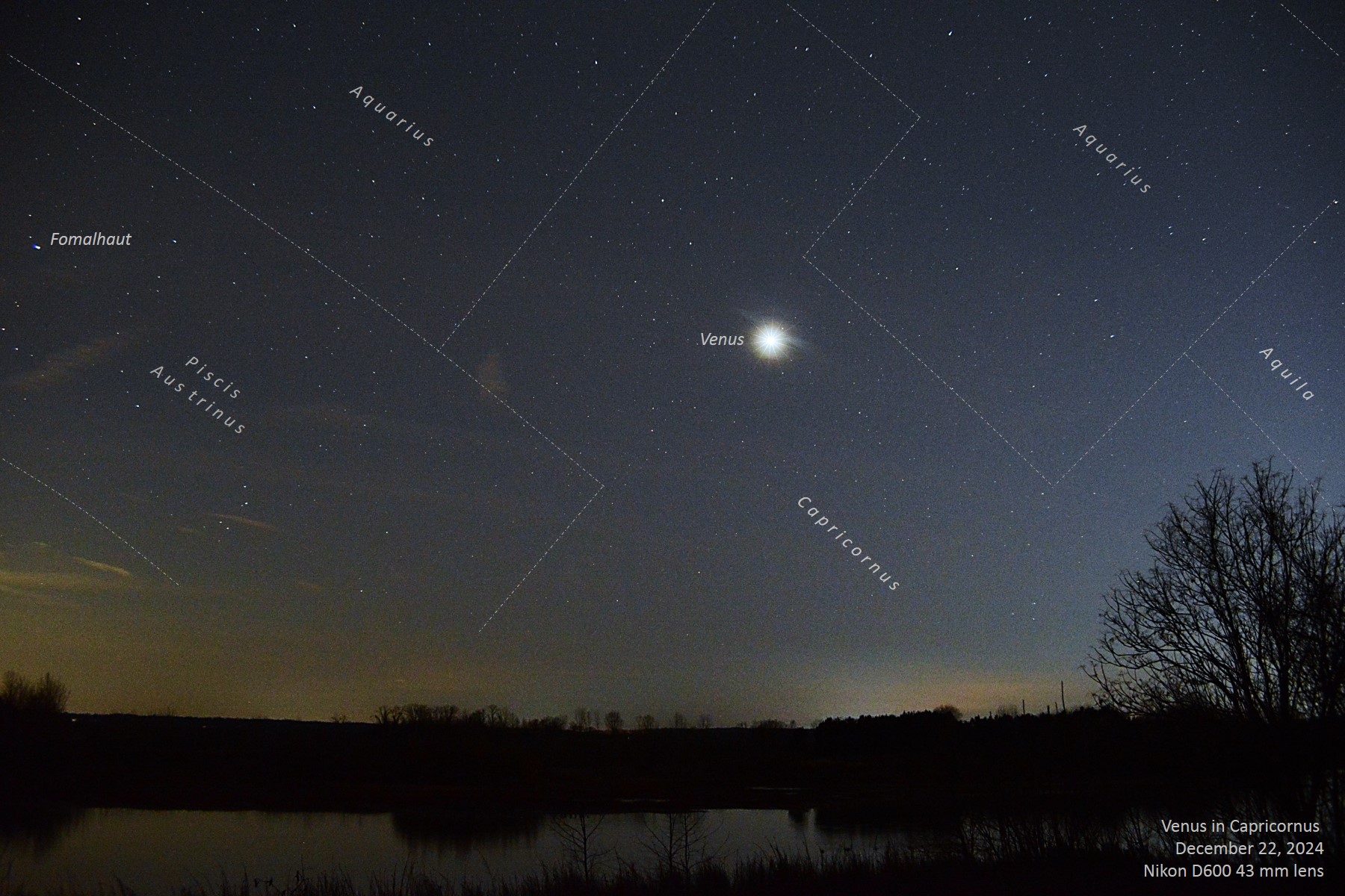 In late December 2024, we are seeing Venus at great elongation from the Sun, now at 46°15'11", and also great elevation above the western horizon, standing 31°24'19" above it at sunset. At this point, Venus is still below (south) of the ecliptic, but heading towards its ascending node on the 16th of January. After ascending node, it makes its most northerly passage between the Earth and Sun of the five different kinds of inferior conjunctions that it undergoes, which will occur on March 22, 2025. If the weather is clear and the skies clean, it should be possible to see Venus in the daytime on that date! Even though they won't be visible, it's interesting to note that on that date, three other planets are in the immediate vicinity ~ Mercury about to pass through inferior conjunction, Saturn just having passed through superior conjunction, and Neptune even more recently passing behind the Sun at its superior conjunction. Of course, we could simply call those events conjunctions; the "superior" is redundant in the case of outer planets. Based on the planetarium software I use, Orion's TheSky™, by looking at the position of Venus during different instances of this kind of inferior conjunction, I would say that this is the only time when Venus comes to inferior conjunction within the boundaries of Pegasus (!) instead of Pisces. In 2017 and also 2033, Venus is clearly in Pisces on the date of inferior conjunction. | ||