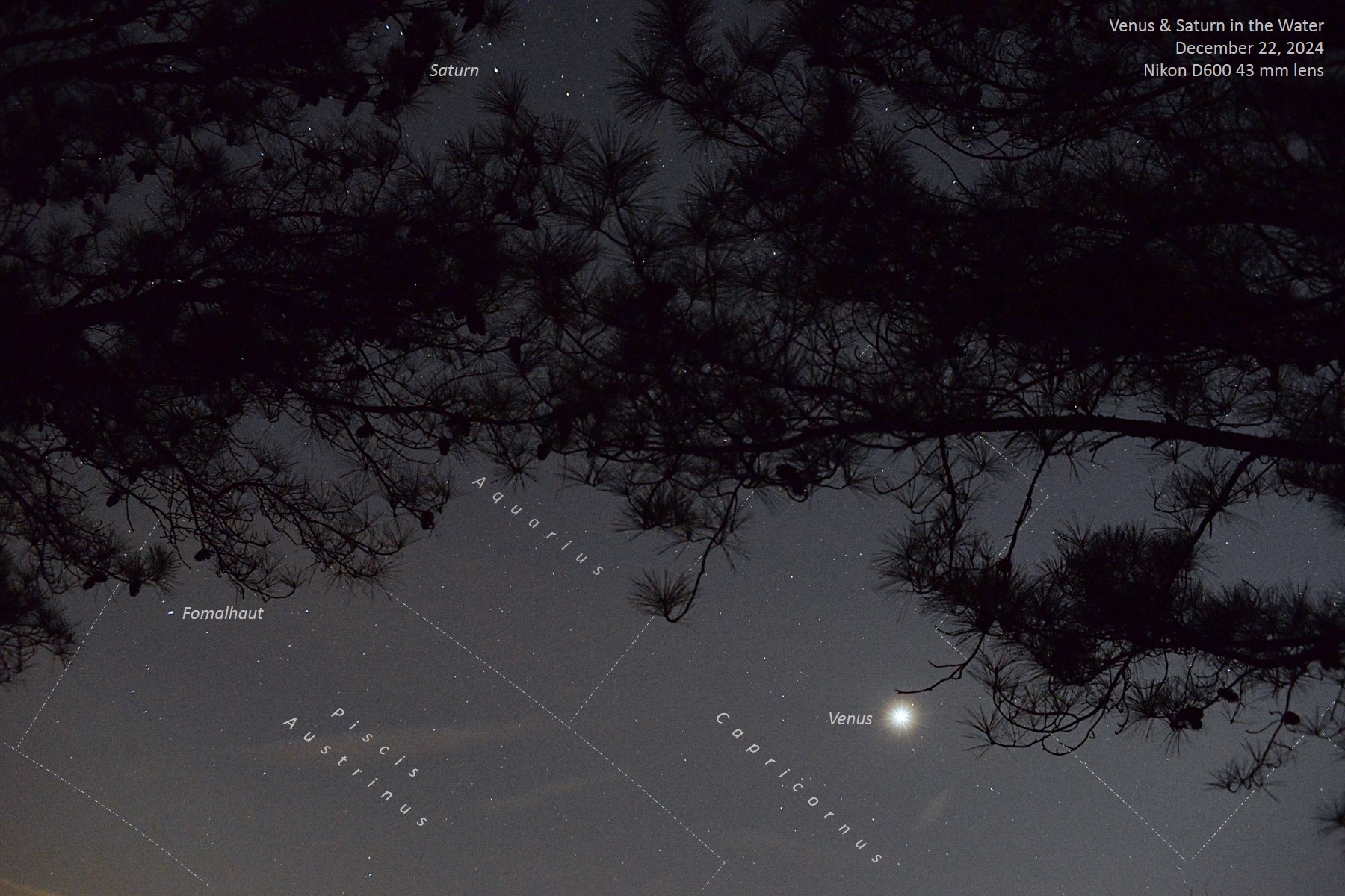 | On the evening of December 22, I got several different views of Venus from one of my favorite places in King George County, Virginia ~ an area to the east of a quarry and mining location which includes several large ponds; it's one of the few places where I can get views over an expanse of water and there are also some nice pine trees against which it's possible to frame the scene to make it a little more interesting. The images were sharpened, contrast adjusted, and in the middle example, also color-modified. Saturn is hiding amongst the pine branches in the third picture. | |||