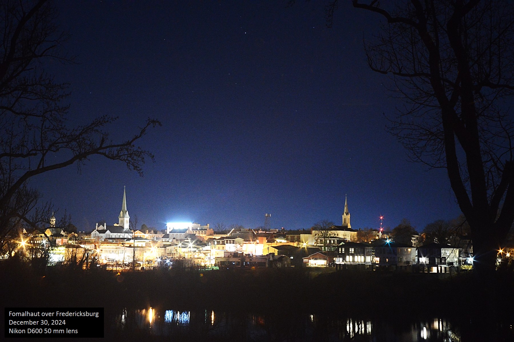 | The Fredericksburg skyline is low but interesting owing to the multiple church spires that are still allowed their position of prominence against the remainder of the buildings. Here we see the steeples of St. George's Episcopal Church on the left and Fredericksburg Baptist Church on the right against the backdrop of the constellation Piscis Austrinus, the southern fish, led by its lucida, the 18th brightest star in the night sky, Fomalhaut. The smaller, domed spire on the far left is the tower on the Fredericksburg Circuit Court building. Unannotated image | |