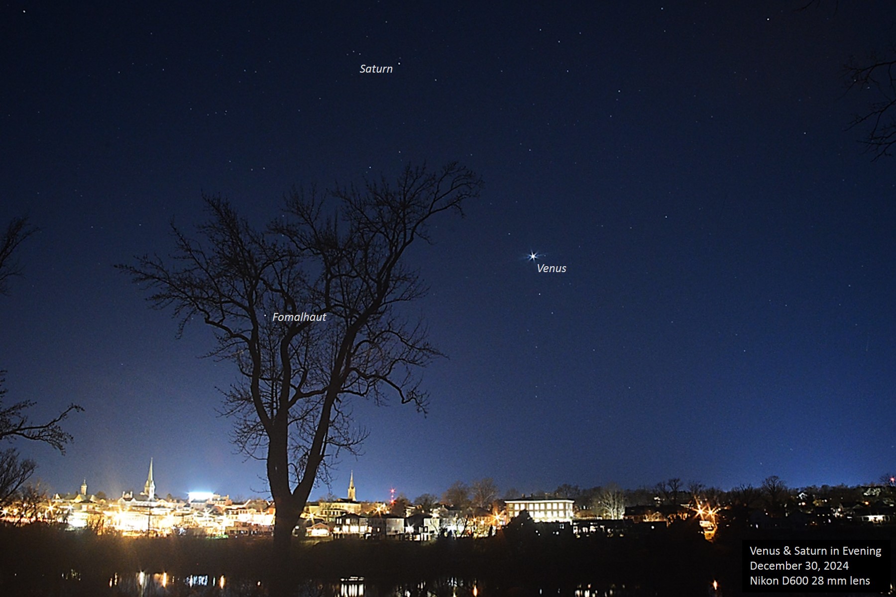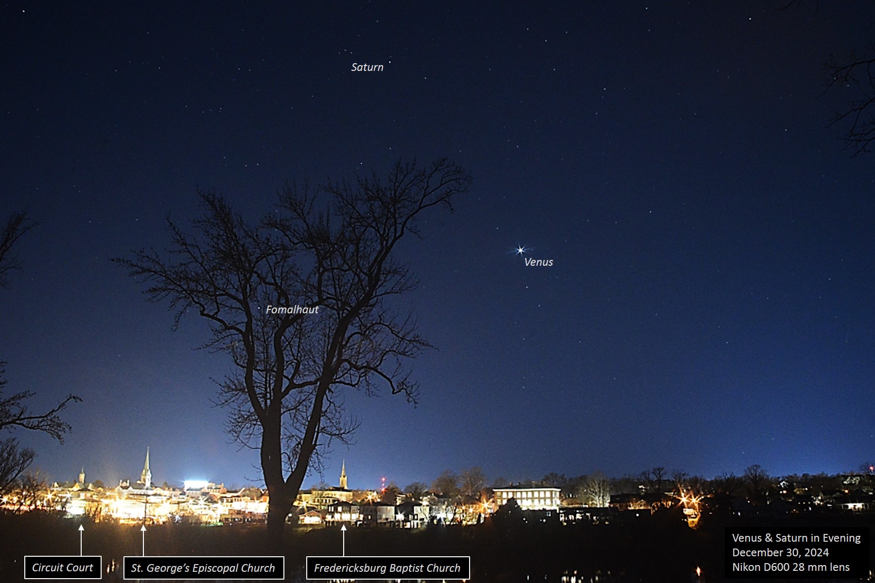 | I wanted to get some pictures of various sky scenes from the middle of the city, with for example one of the church spires in the foreground with Venus or Jupiter amongst their respective host constellations, but this proved impossible owing to the brightness of the lights all over downtown. Therefore, I retreated to a spot I've used before, which is somewhat up the hill leading toward Chatham Manor; it's dark there and affords a nice view across the river to the Fredericksburg skyline. The lens I used for this picture is an old Vivitar 28-200 mm lens set at 28 mm. Back in the 1980's and 1990's this lens was my favorite, only because of its huge range. It doesn't do anything particular well but if you can only take one lens with you for a wide range of focal lengths, it's hard to beat. Zooming in to use the lens at a more moderate focal length, for example 50 mm, allows us a view of the skyline with less distortion. | ||||