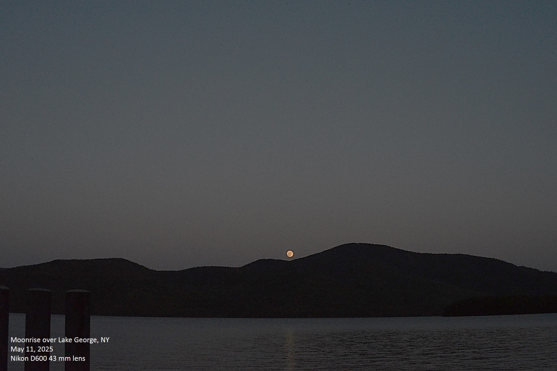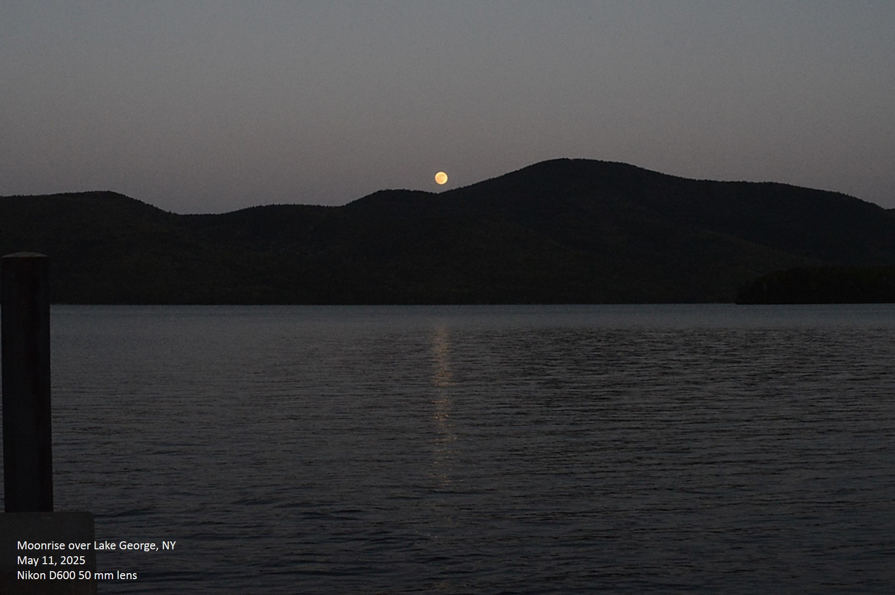 Early May in upstate New York included some spectacularly beautiful days for the Monther's Day weekend, coinciding with a nearly full Moon. Two days before the actual full Moon, we captured the Moon rising over the mountains east of Lake George, from a vantage point in the southern part of Bolton Landing looking out over the lake. My setup was a Nikon D600 full frame camera with an old Nikkor 70-210 zoom lens set to full zoom. |