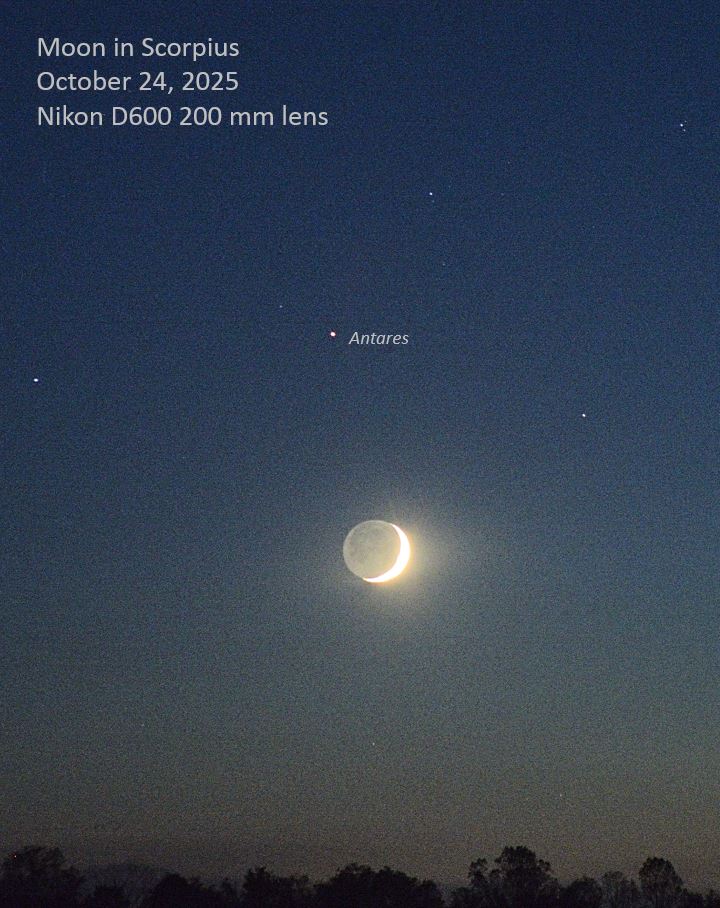 The crescent Moon passes well to the south of Antares this evening. This year, just like last