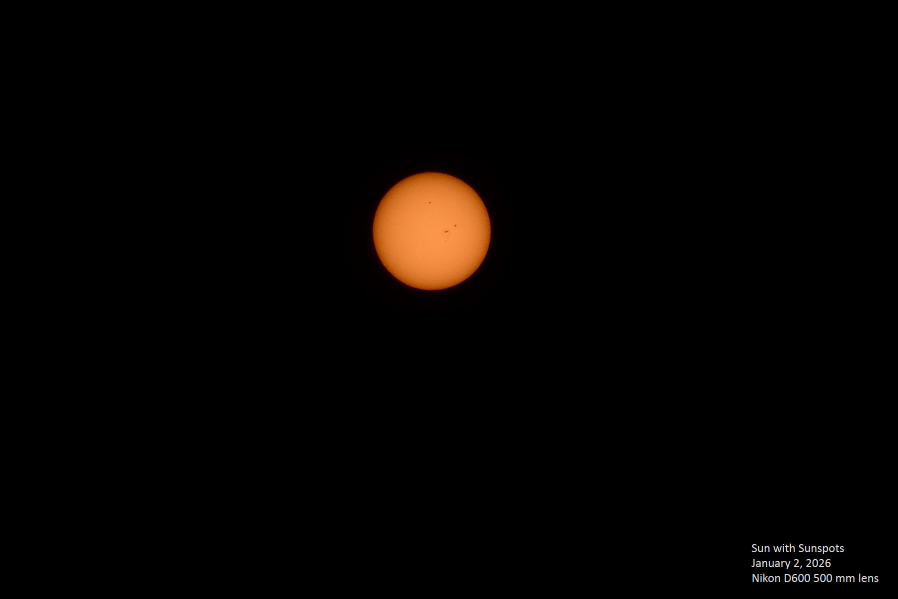 The Earth is one day away from being at the perihelion point of its orbit (this will occur on January 3), so we are seeing the Sun at nearly its largest it can get in our sky. Compare the size of the Sun today with that of July 4, 2025, which was one day after aphelion, the farthest point from the Sun in our orbit; as can be seen from the images, it's almost impossible to tell the difference just by looking at them. Using the figures of 152.1 million km for Earth's aphelion distance and 147.1 million km for its perihelion distance, we see that this ratio is 1.034, so our measurement of the disk sizes is not quite accurate. Meanwhile, Venus and Mars continue to approach their respective conjunctions. All three objects are moving toward the lower left when measured against the stars, but Venus is outpacing the Sun, while Mars is being outpaced by the Sun. Unannotated image. |