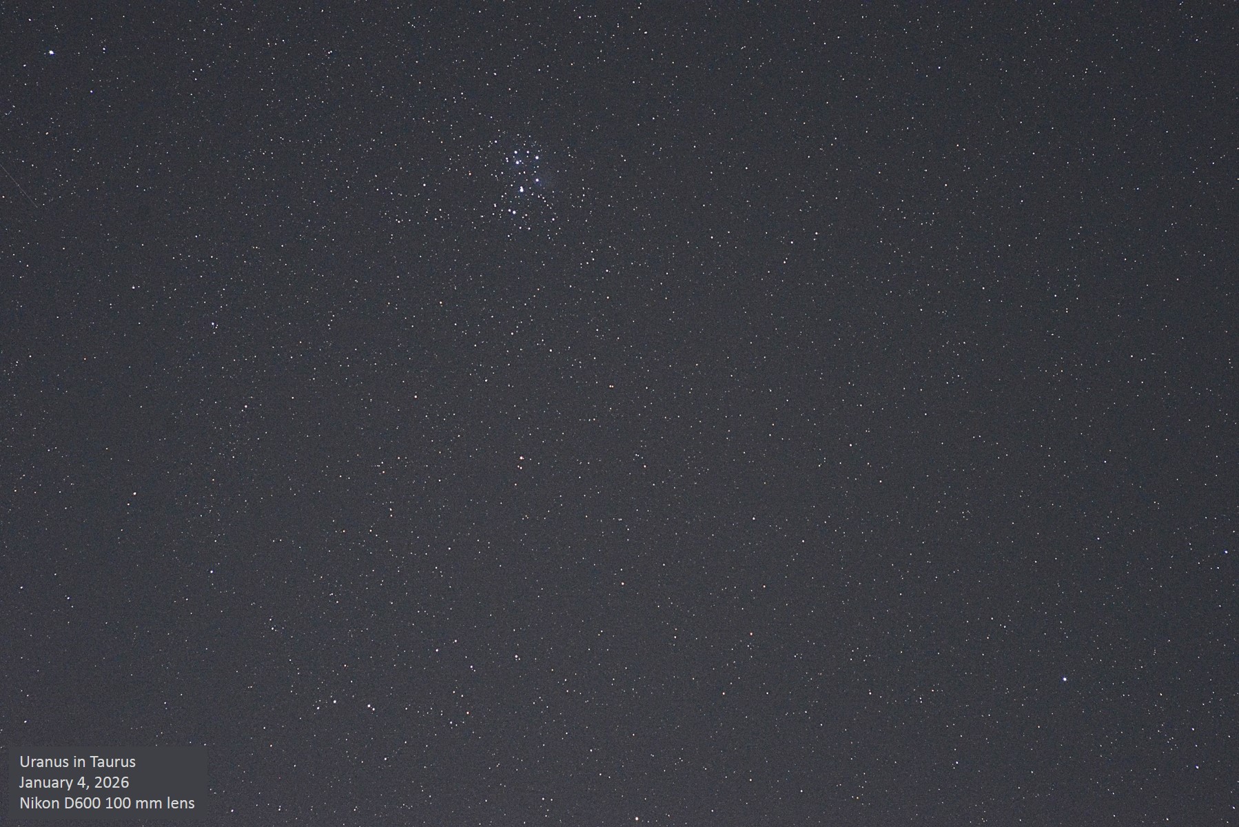 Uranus continues to occupy a position just below the ecliptic in the area south of the Pleiades. On this evening, it shines at magnitude +5.63, which is almost exactly the same as the star 13 Tauri, shown on the annotated image just to the lower left of Uranus. Uranus is still retrograding, i.e., moving westward against the stars, but this will last for only one more month, since it will resume eastward motion on February 4, 2026. Unannotated image. |
