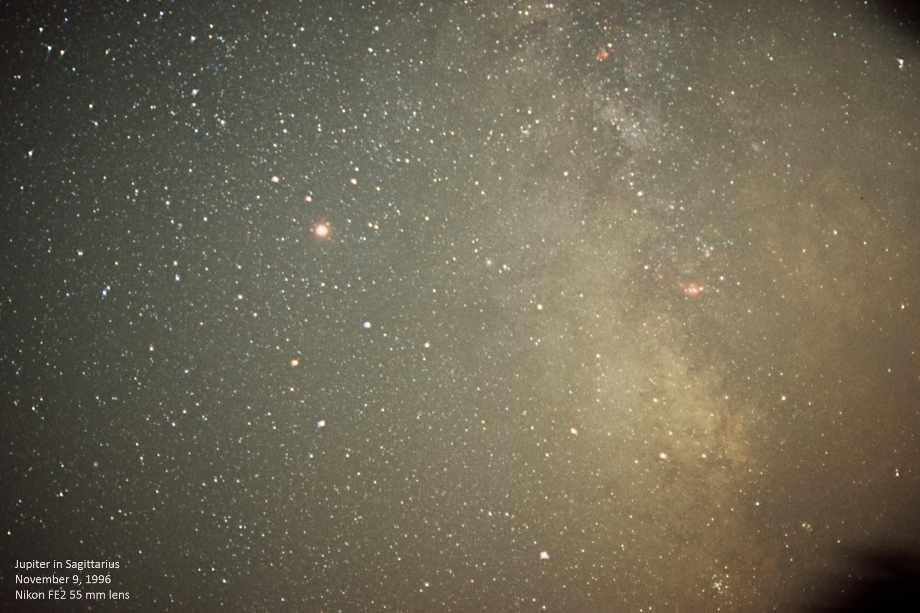 Jupiter spent 1996 in Sagittarius, reprising its performance of twelve years prior, in 1984, and which it would nearly duplicate in 2008 and 2020. This photo was probably taken from the mountains, on the date of November 9th. The horizon is the blurry dark area in the lower right corner. Jupiter was magnitude -2.08 this evening. Note how the slide film does a good job of recording the deep red color of emission nebulae. We also serendipitously caught Neptune (magnitude +7.95) at the left edge of the picture; see how the film faithfully recorded Neptune's blue color. Unannotated image. |