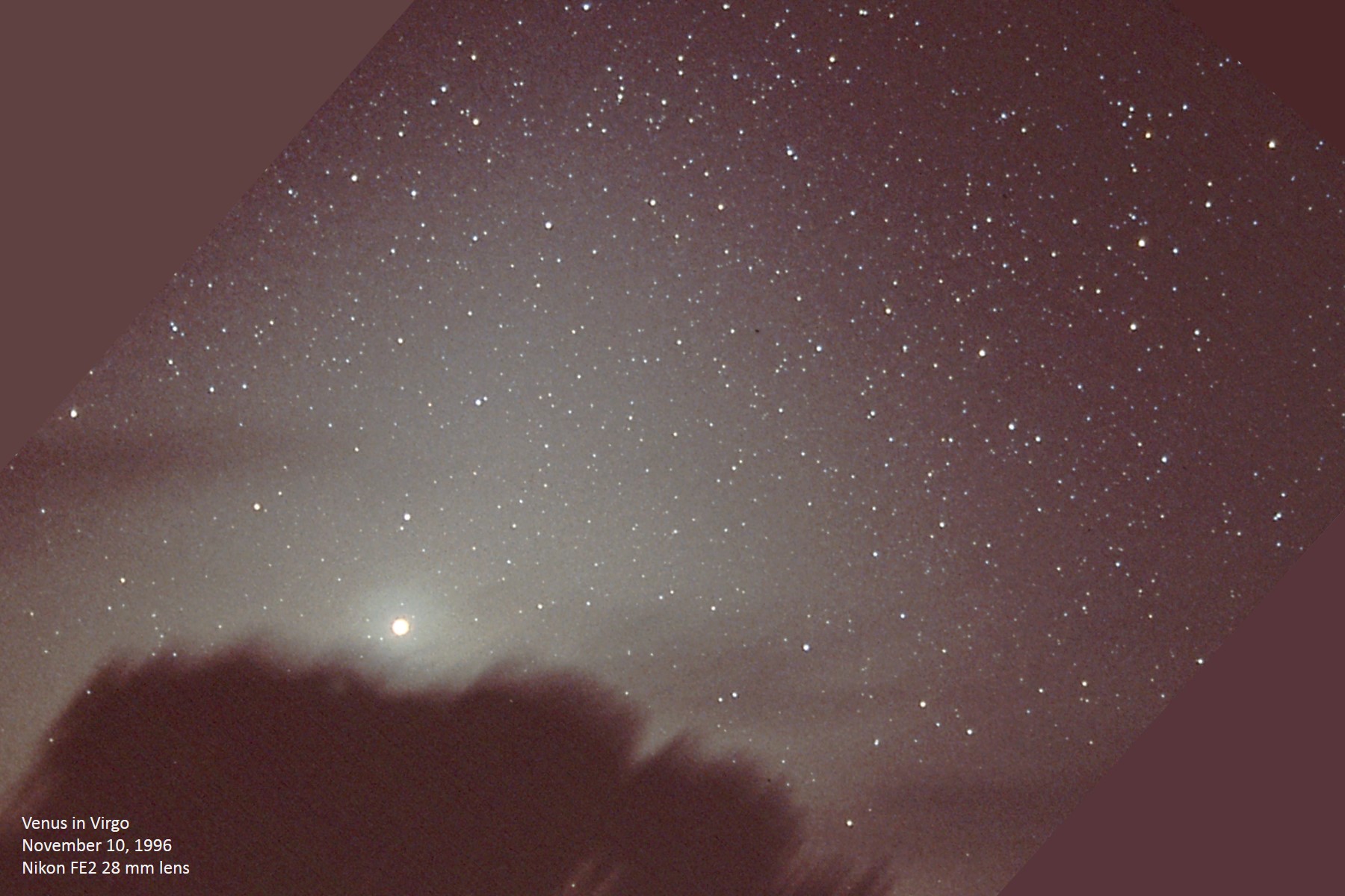 Venus offered two excellent apparitions for northern hemisphere observers in 1996 ~ the first half of the year was a high evening elongation, followed by the last June inferior conjunction before two transits in 2004 and 2012, then the second half of the year was an excellent show as the morning star. This second half is ending now as Venus gets lower and lower into the dawn, but here we were able to catch it in Virgo while it is still in a dark sky. I must have taken this picture from the mountains because the sky is dark enough to see the zodiacal light. Unannotated image. |