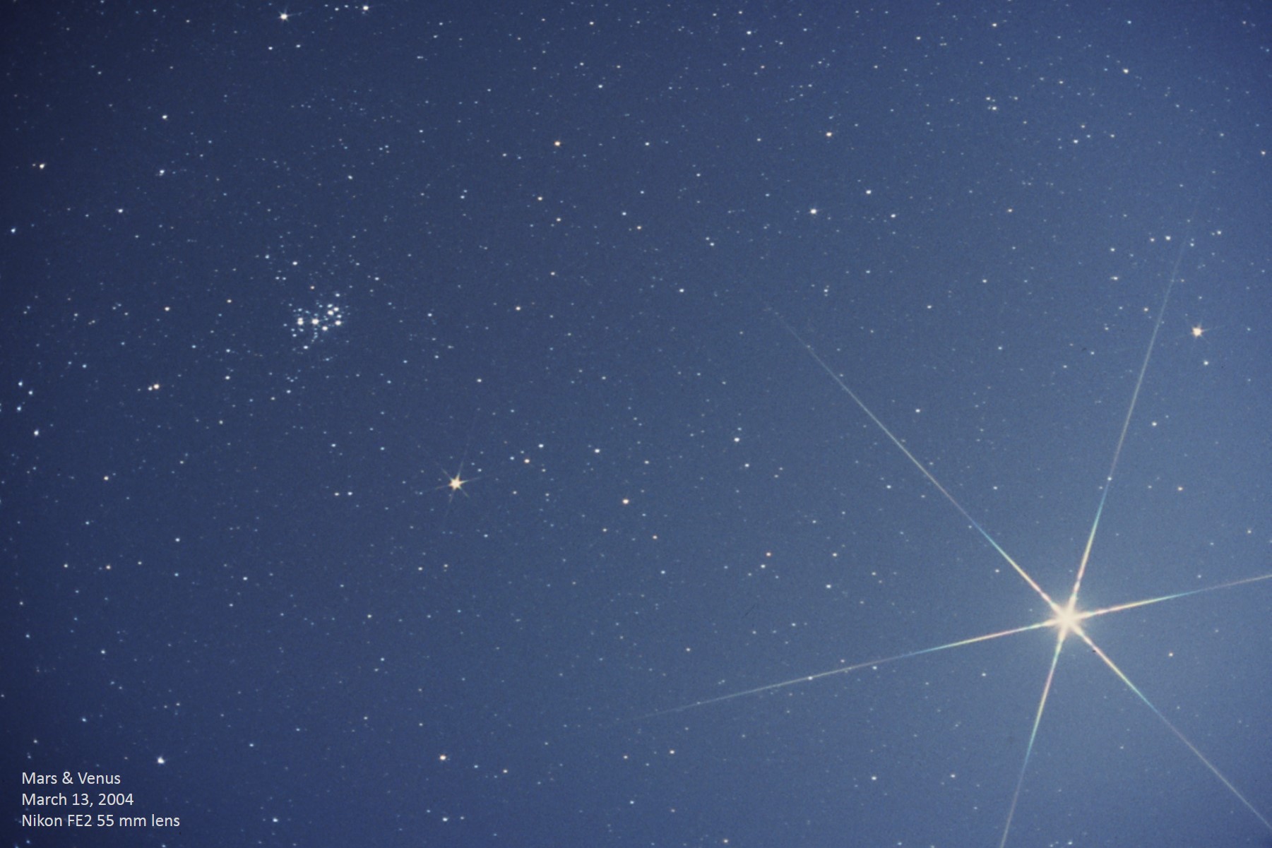 This view of March 13, 2004 shows Mars nearing the end of its epic 2003 opposition apparition, while Venus is heading toward its first transit since the late 1800's in June. We can see Venus is well north of the ecliptic and still gaining in latitude leading up to its passage south of the Pleiades on April 3, 2004. Venus is magnitude -4.27 and Mars is +1.25 this evening. Unannotated image. |