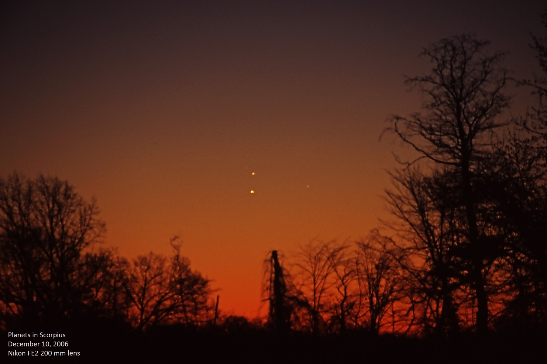 In late 2006, we were treated to a very nice trio of planets low in morning twilight, in fact so low that it was difficult to photograph. Jupiter and Mercury were lined up vertically near Graffias, β Scorpii, with Mars off to their right, just on the south side of the ecliptic. In this photo made with a 200 mm lens, we see Jupiter at magnitude -1.75, Mars is +1.54, and Mercury is magnitude -0.59, with a separation of only 19'42" between Jupiter and Mercury. Unannotated image |