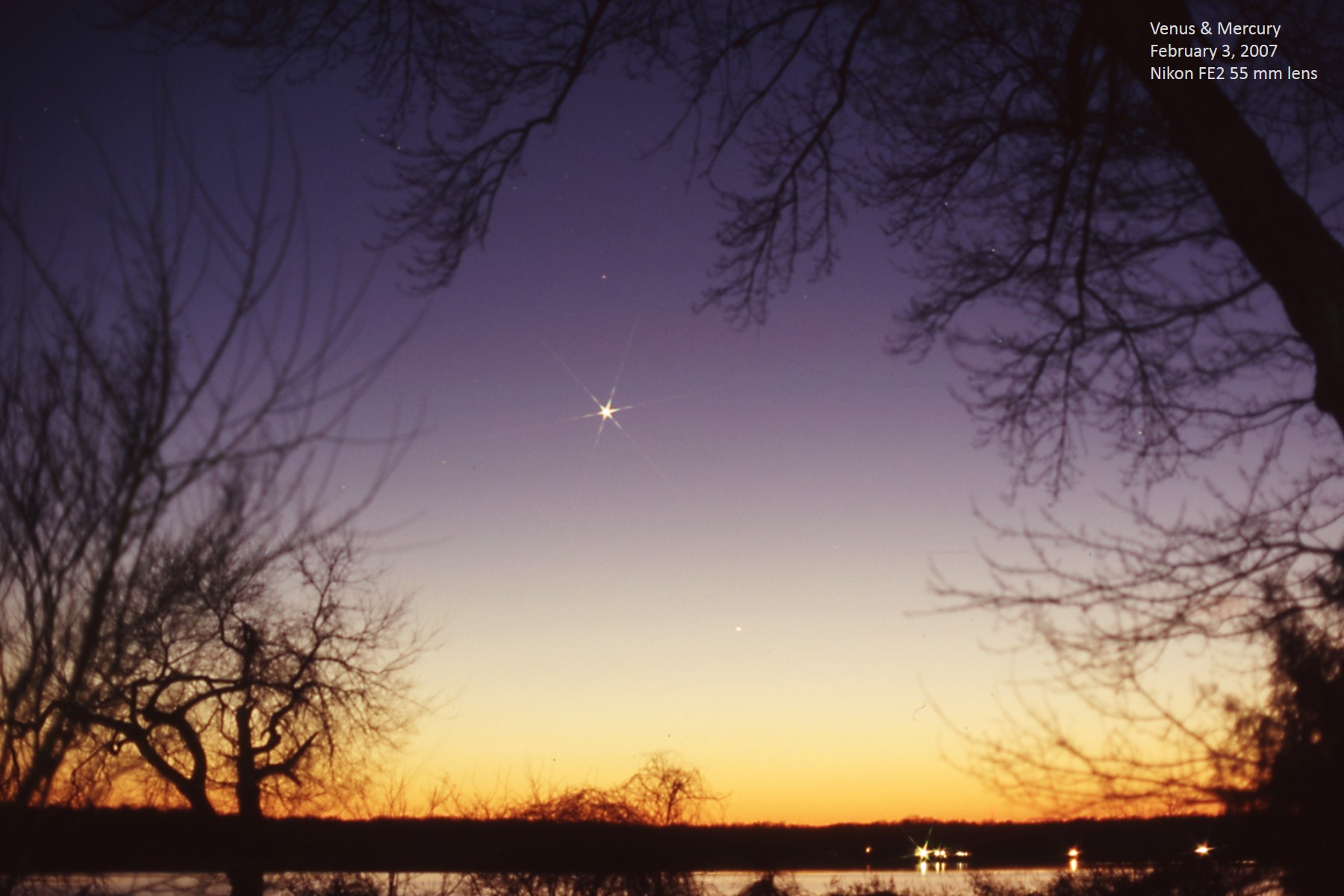 Venus is in the early stages of one of its January to August apparitions, and the current position in Aquarius shows it just beginning to emerge out of the sunset glow into dark skies. This type of apparition is similar to 1991, 1999 2015, and 2023. Strangely, I can't recall from where I took this picture; the only locations I can think of are across the Potomac or Rappahannock Rivers, looking to the west, but I don't recognize the scene on the far bank. I took this picture with my old Nikon FE2 and Nikkor 55 mm f/1.2 lens using slide film. It was just mounted on a static tripod with no tracking; often I piggybacked the camera on one of my telescopes but for this kind of shot, that would not have worked well. The slide was scanned in 2025 and then sharpened with brightness and contrast adjustments made to create the result. I estimate that the picture was taken about an hour after sunset, looking in a west-southwest direction; Venus has an azimuth of 248° this evening, which makes it 22° to the left of due west. |