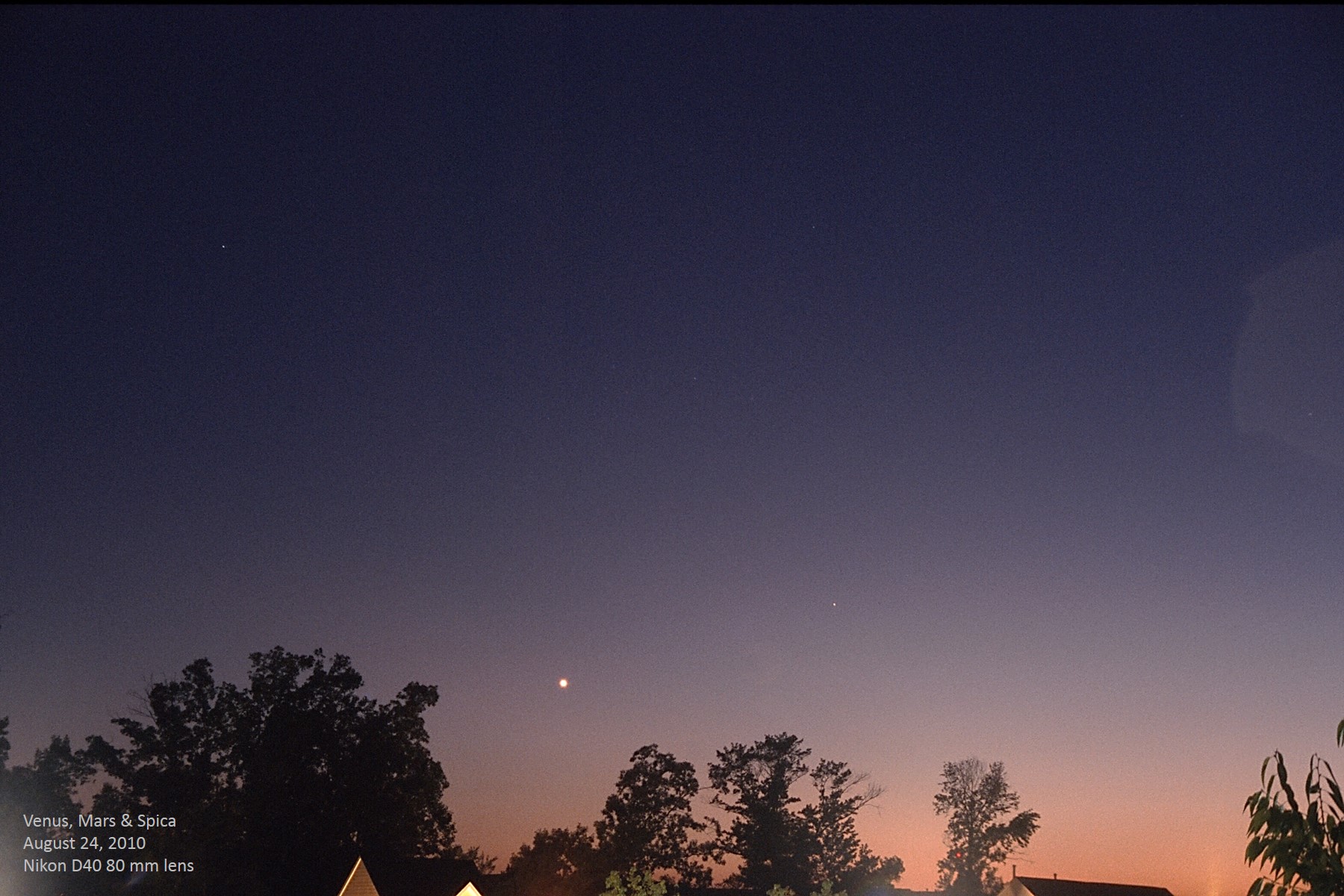 In 2010, Venus was reprising its apparitions of 1986, 1994, and 2002, and which it would repeat again in 2018 and 2026. These begin with a slow rise into the evening sky beginning in January, resulting in a moderately high elevation by the late spring, and then declining elevation while still gaining in elongation from the Sun until September. After that it begins to slow quickly and then fall back even faster to its inferior conjunction, which means it passes between the Earth and Sun (although this time doing so far south of the ecliptic) in late October. Mars is concluding its apparition that began in early 2009 and culminated in its opposition in Cancer on January 29, 2010. Now it is close to being on the far side of the Sun, the position of which is known as superior conjunction. At the time of this picture, Saturn was to the lower right of Mars, buried too deep in bright twilight to be seen anymore. Exactly two weeks before this photo, August 10, the planets made a close grouping, all fitting in a circle with radius of 3°. I wish I could have recorded that event! |