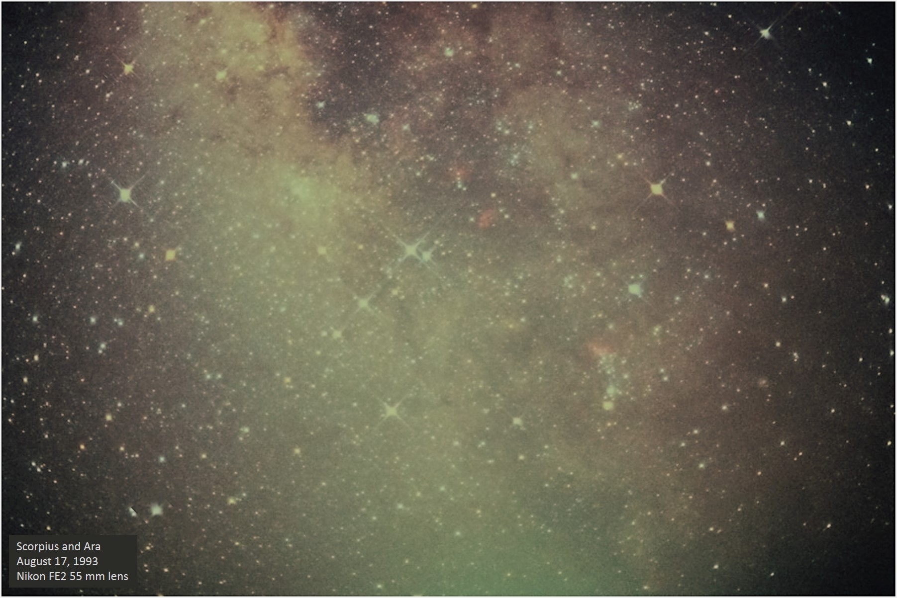 | I had a memorable trip to southern Texas in August 1993 ~ I didn't go to Big Bend National Park, but rather drove down to South Padre Island in an attempt to do some astronomy, but decided that wasn't suitable for some reason. I drove back up and stopped at a point near Carrizo Springs to take pictures. It was quite dark where I was except for some kind of bright light source due south which affected this picture in particular. The slide film I was using at the time showed the sky with a purplish tint. Many of the clusters and nebulae in the frame are marked. Carrizo Springs is at latitude 28°30' which is further south than any place in Big Bend. Back |