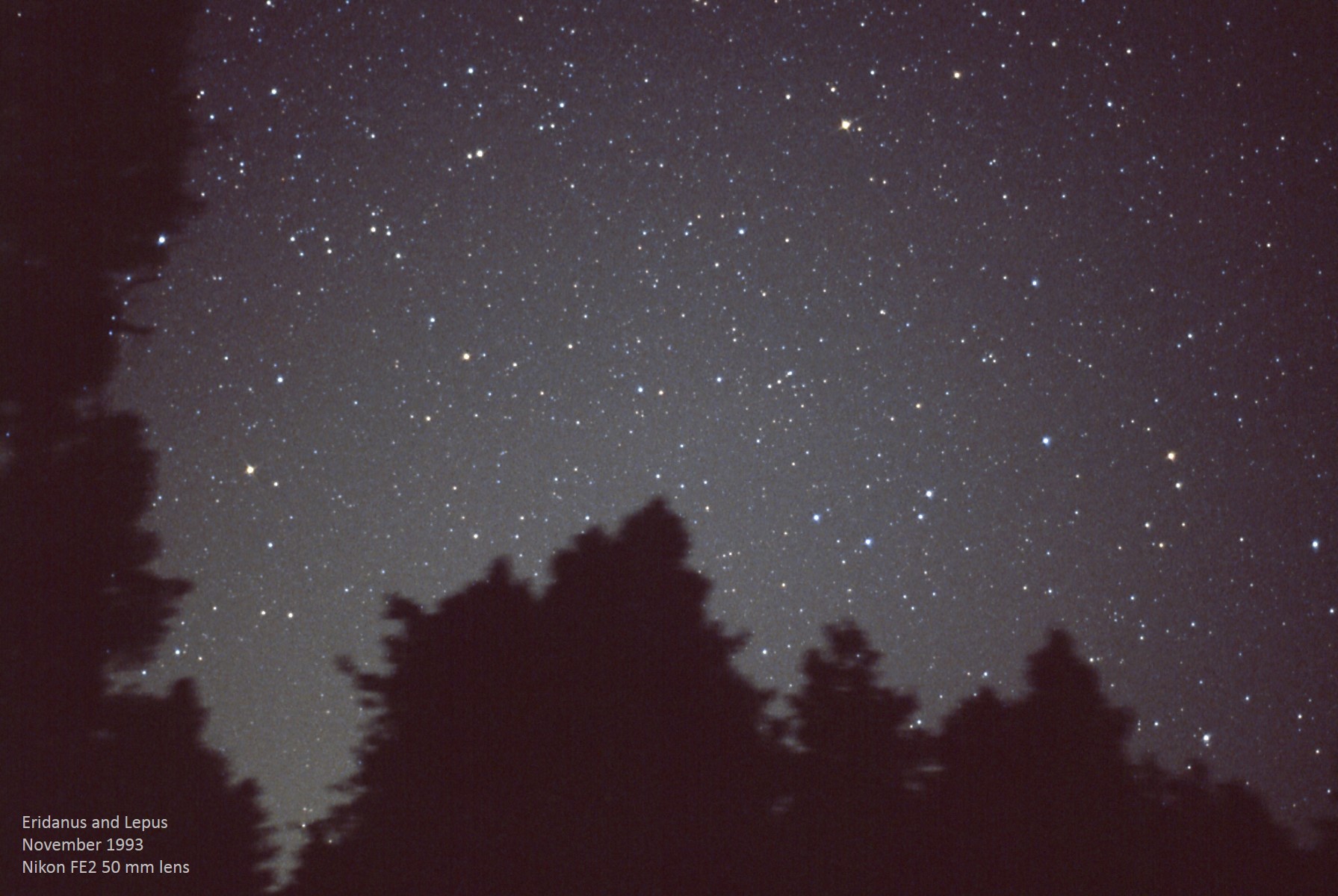 Sometime in November of 1993, I took some pictures of the fall constellations from Colorado. This image shows the mid-southeastern part of Eridanus, along with the western portion of Lepus and the northeastern corner of Fornax. Probably the most interesting object in the picture is R Leporis, the famous carbon star known as Hind's Crimson star. Unannotated image. |