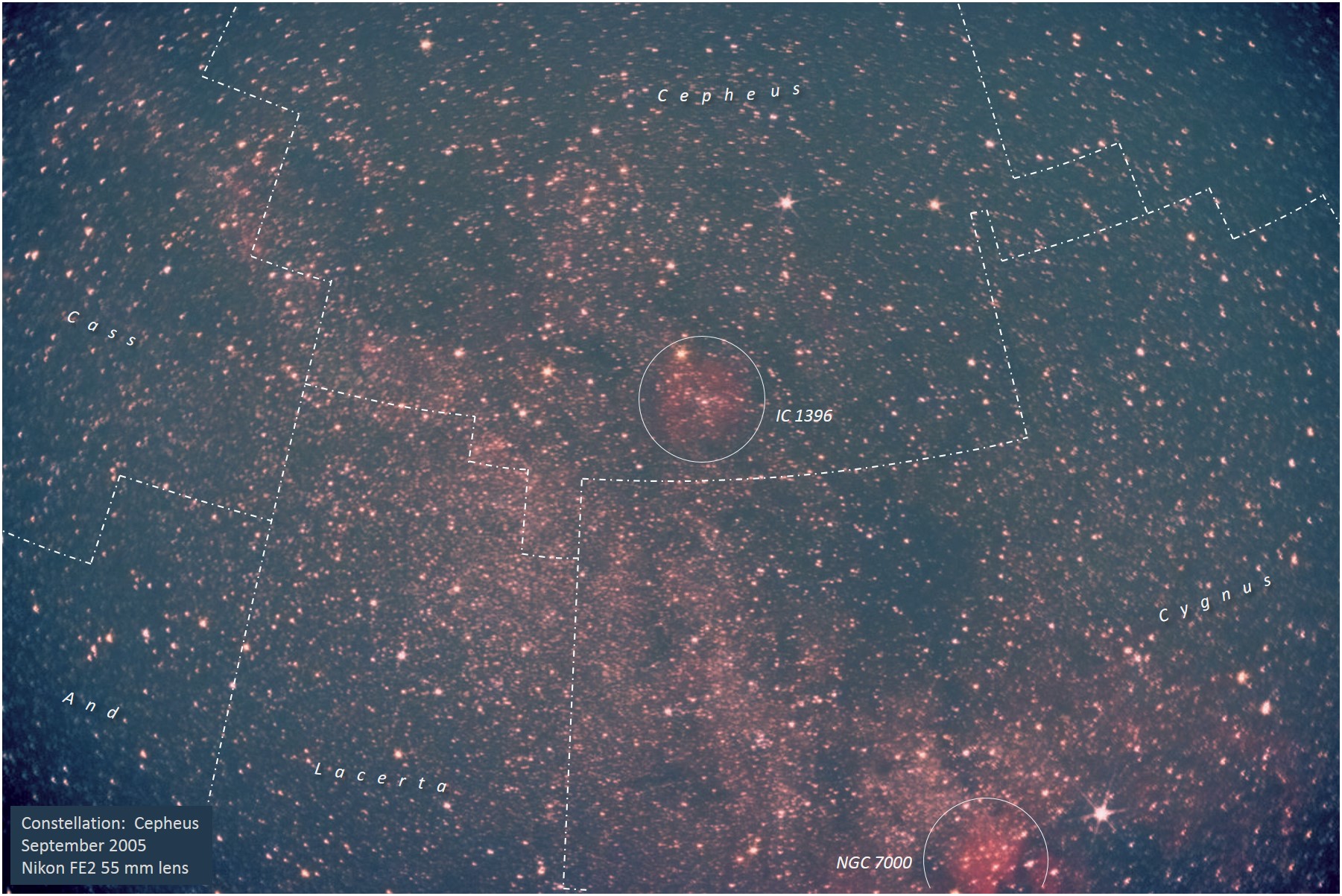 Sometime in the fall of 2005, I tried some wide-field long-exposure photography with my Nikon FE2 piggybacked on a C8 and probably using a 55 mm f/1.2 lens and ISO 400 or 800 speed Ektachrome or Fujichrome film. The distortion at the edges is bad and the tracking wasn't clean, but it's one of the only photos I ever took with an unambiguous rendering of IC 1396 in Cepheus. Although the details are smeared out owing to the poor tracking, the main outlines of the Milky Way are readily apparent, especially the large dust clouds where I placed the labels "Cygnus" and "Cepheus". Unannotated image, Back to constellations |