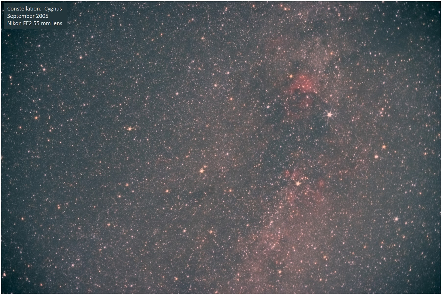 | In September, 2005 I tried some wide-field photography with my Nikon FE2 and 55 mm f/1.2 lens piggybacked on my Celestron C8 telescope, paying careful attention to tracking and balance of the scope. This is one of the best astrophotos I ever took with film in terms of capturing faint nebulosity. Not sure what aperture I set the lens to, but it most likely was not all the way open, maybe stopped down one stop. The northern coalsack under the Pelican Nebula is very apparent, as is the dark dust cloud at upper right toward Cepheus, known as Le Gentil 3. Back |
