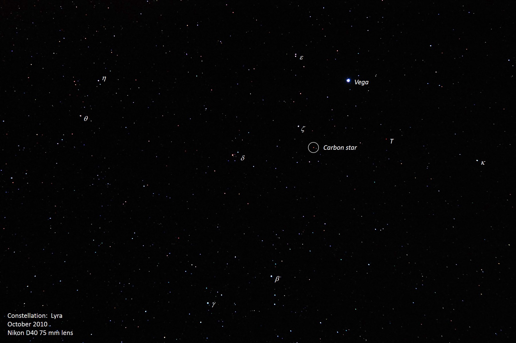 The constellation Lyra is dominated by Vega, the fifth brightest star in the sky, however it also includes numerous other interesting objects. One of the most famous is M57, the Ring Nebula; this object is not marked on the image but is located about half-way between beta and gamma Lyrae. The star near the center top of the image, marked as epsilon, is the famous "double-double" of Lyra ~ it is an easily resolvable double when viewed in binoculars, but with a telescope, each component resolves into a tight pair of stars. Oriented at right angles to each other, they are striking in a telescope. Other double stars in Lyra, suitable for viewing in binoculars or small telescopes, include delta Lyrae, beta Lyrae, and zeta Lyrae. Delta is more like a pair of separate stars than a double star but nevertheless they share the same designation of delta. They are slightly over 10' apart which is about 1/3 of a Moon diameter. Zeta is the 3rd star making a triangle with Vega and epsilon; it presents as two stars of unequal brightness with 44" between them. It should be separatable using 7x binoculars if you can hold them steadily. The star at the bottom right corner of Lyra is known as beta; it consists of two unequal stars with a separation of 46", which should also be suitable for 7x binoculars, except that the two stars are more unequal than zeta. Binoculars with 10x have a better chance at splitting beta. Finally, the Lyre also hosts two examples of the class of object known as carbon stars. These are stars with extremely sooty atmospheres that tend to absorb all the light from star except for the deep red end of the spectrum, making them appear extremely red. The famous one is known as T, and can be found southwest of Vega. T Lyrae is quite faint, so it requires a small telescope to find. I have not been able to find it with binoculars, but my eyesight isn't the best, so give it a try yourself! Lastly, we have another carbon star to the east of T, which I circled and which has the designation HK Lyrae; it is almost the same mag- nitude as T but does not appear quite as red, to me anyway. |