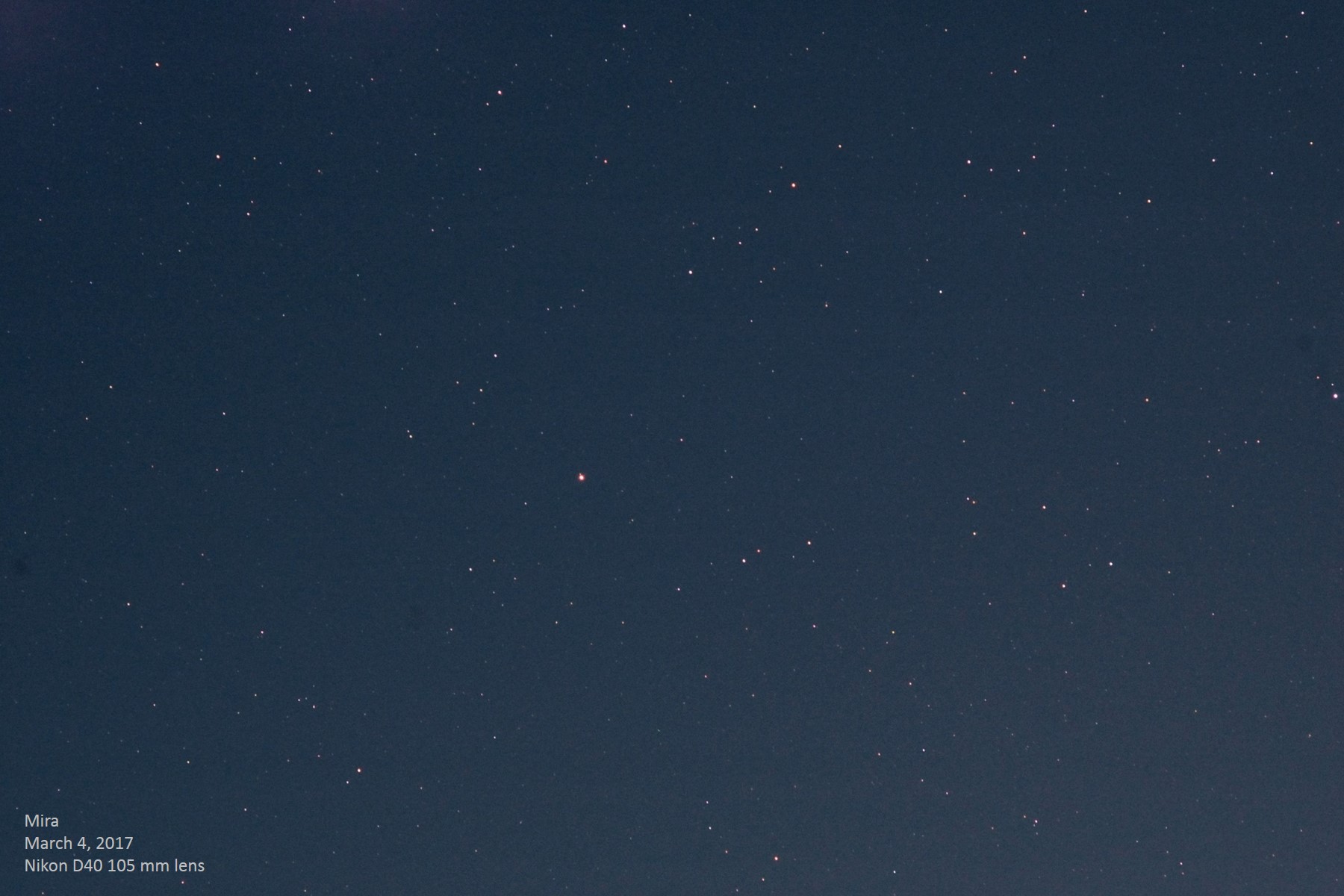 This image was taken with a Nikon D40 and a 105 mm lens, which equates to a camera with a full-frame sensor using a 157 mm lens. My camera was positioned to be horizontal with respect to the western horizon, so north is pointed to the upper right. Alrischa, the α star of Pisces, is at the right edge of the frame in the center. Alrischa is magnitude 3.82, and even though image brightness falls off at the edge of a picture, it certainly seems as if Mira is a good bit brighter than Alrischa. This light curve on Wikipedia shows the maximum on the right side of the graph, from which we read that the average estimate of its brightness was about 3.5 during late February 2017. Careful examination of the image shows that there is a very faint reddish star just off of the upper left of Mira. This is HD 14411 and has a magnitude of 9.28, giving one the appearance of the double star γ Ceti. I may put this on my observing list because their separation of 2'03" suggests a wide "planet and moon" look at low power. Mira's spectral classification is M5e-M9e, which indicates a red giant or dwarf star, ranging from cool to very cool, exhibiting emission lines in its spectrum. Its period varies somewhat but is generally around 11 months. |