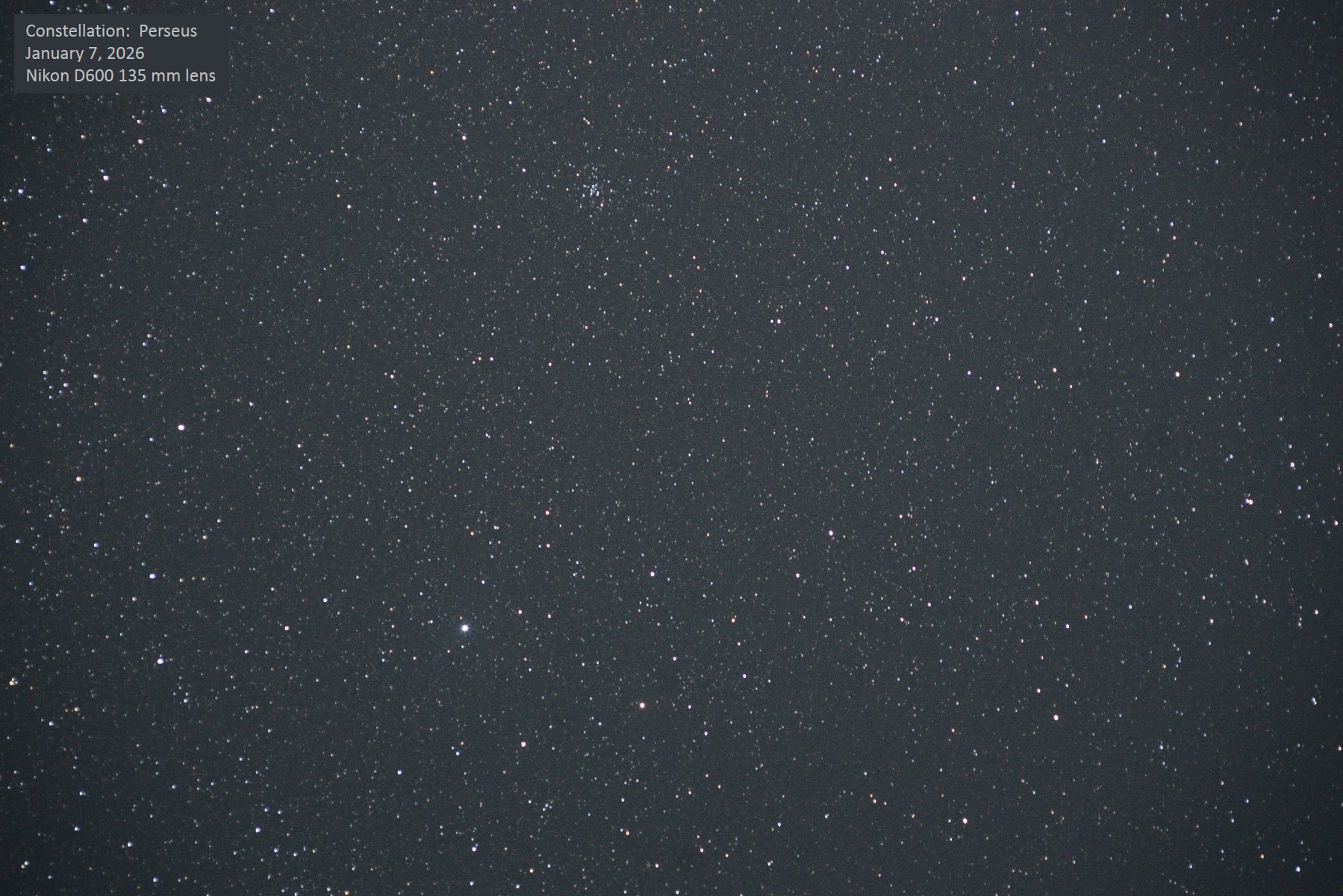 This view of Perseus focuses on the southwestern portion of the constellation, centered on the star β, otherwise known as Algol. The main deep sky object in this area is M34, the large open cluster close to the border with Andromeda. South of M34 is a bright but small galaxy, NGC 1023, and just to the east of Algol is the grouping of galaxies known as Perseus A, the largest of which is NGC 1275. Unannotated image. |