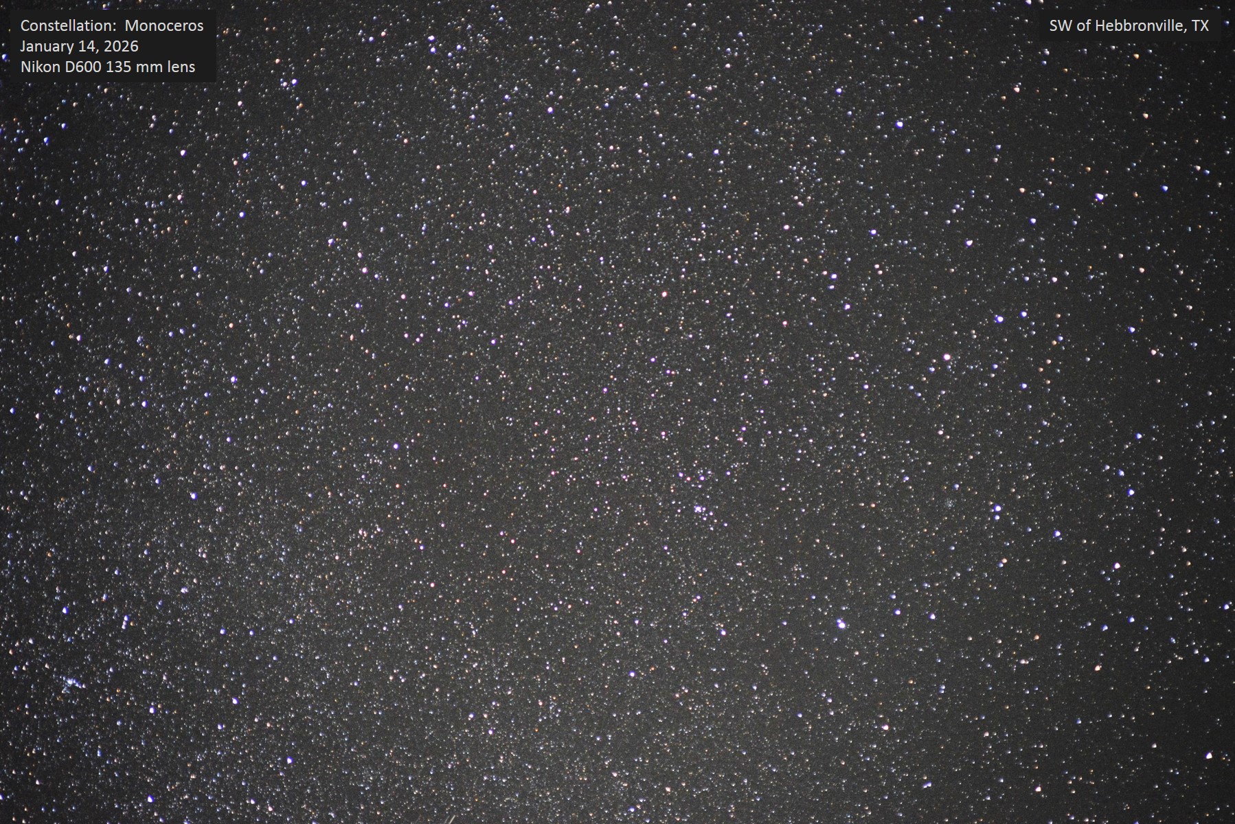 This image shows the region of west center Monoceros where it meets the southeastern corner of Orion. The main object in this area, which as can be seen from the constellation boundaries, was imaged as it rose in the early evening so the camera, horizontal with the eastern horizon, is oriented so that north is to the upper left, is NGC 2301. This and the other five objects are all open clusters as we would expect for the winter Milky Way. The locations of two of them, as plotted in Orion's TheSky™ planetarium software, are somewhat off and which therefore necessitated some research into their exact whereabouts. NGC 2250 and NGC 2232 are the clusters that didn't quite match the locations in the planetarium software. Unannotated image. |