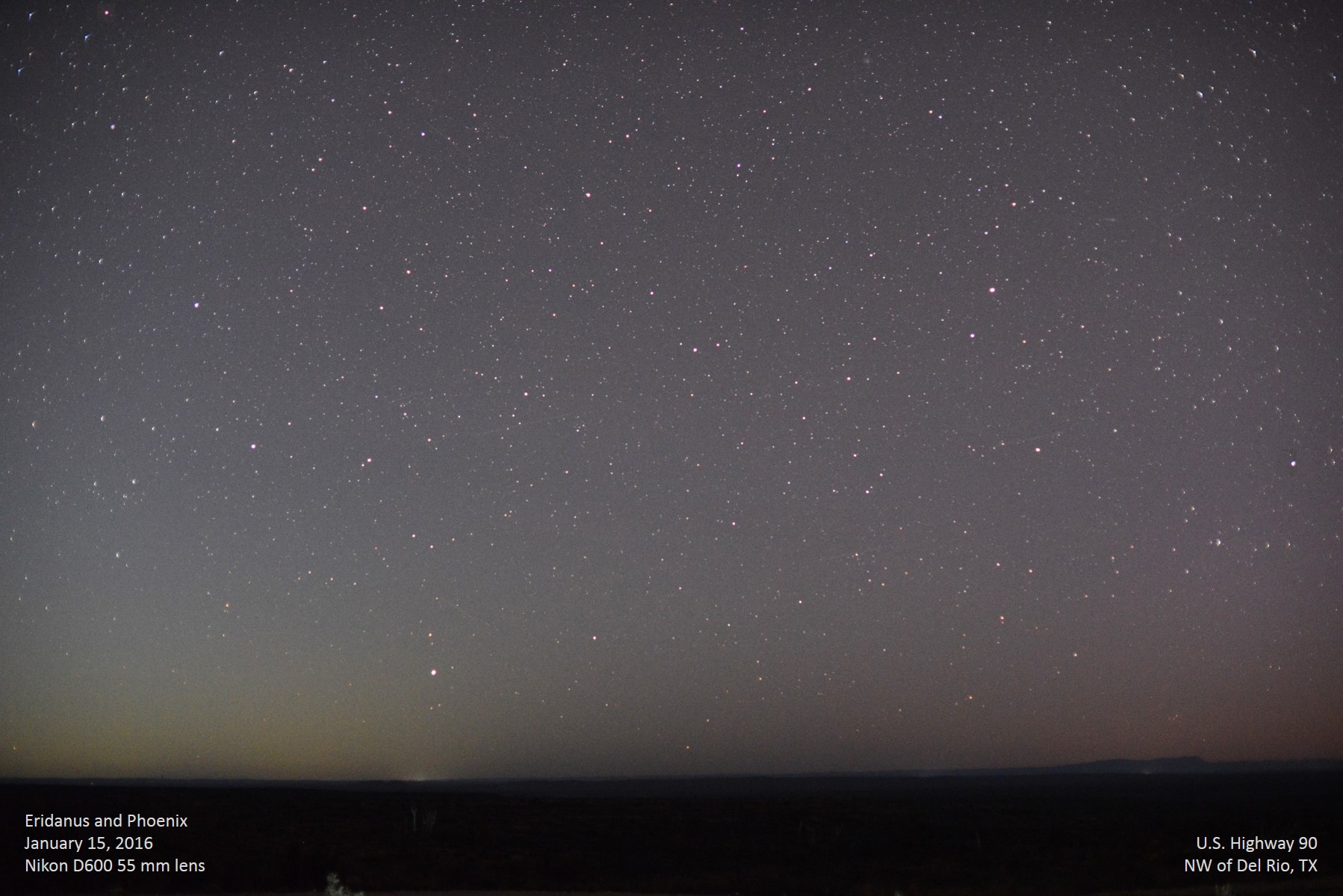 From a high point about 50 feet above route 90 west of Del Rio, Texas, I enjoyed a perfectly flat southern horizon to capture Achernar and its environs. This view with a 55 mm lens gives a generally normal view of the constellations, so we see southern Eridanus, Phoenix, and the edges of the surrounding constellations. Of course there are no star clusters in this area, which is not far from the south galactic pole, but we did actually record two of the brighter galaxies in the Sculptor Group, NGC 55 and NGC 300, at upper right. The latitude here was 29° 42', so we can see from the elevation of Achernar that it is farther north than the image from southern Texas. Unannotated image. |