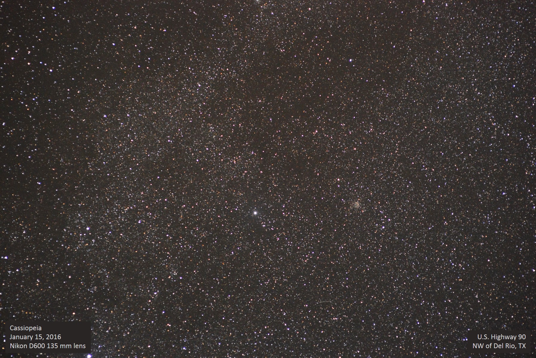 Here we are looking at the western portion of Cassiopeia, focused on the area around β Cass; the showpiece deep sky object in the vicinity is the open cluster NGC 7789, but eight other NGC clusters are indicated on the image as well. The area to the upper right of NGC 7790 appears to very clearly be home to a group of dark nebulae, detectble from the obscuration of the star clouds in that region. Unannotated image. |