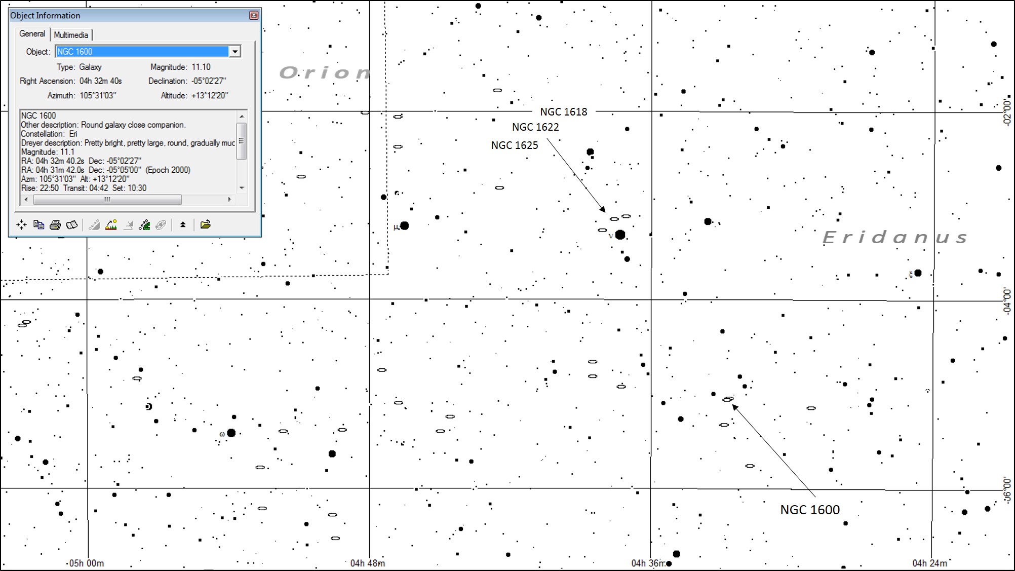 NGC 1600 was easy to located and not difficult to see either. I rated it as fairly large, with a slight central condensation, although the surface brightness was not high. Keep in mind that "large" to me on this evening is still pretty small, but everything is relative! |