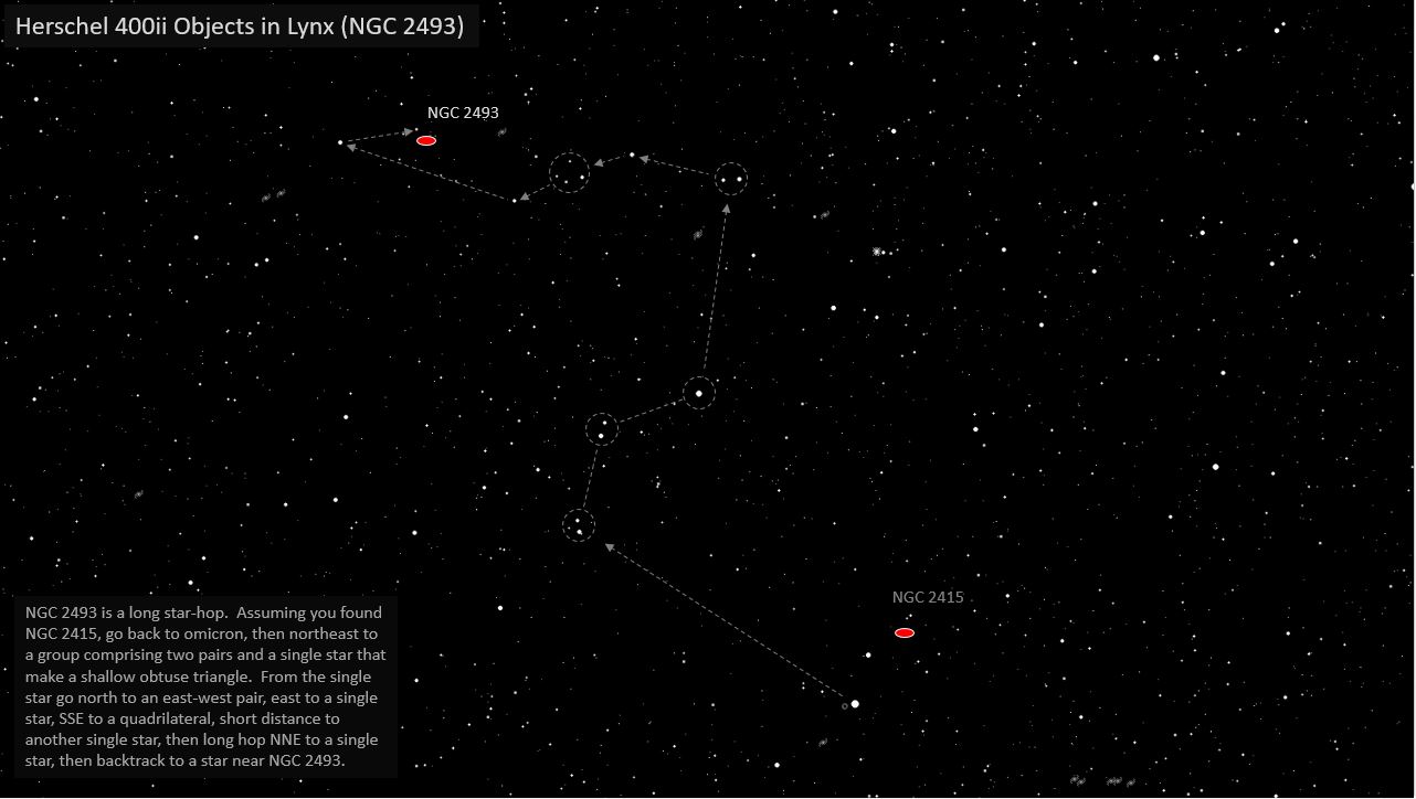 The next galaxy in Lynx, NGC 2493, is located northeast of the first object, NGC 2415, in a rather sparse area that is hard to navigate through via star-hopping. I was barely able to see this galaxy at 76x, although I could barely see it with direct vision, so I guess that's better than having to use averted vision. At 123x, it was easier to tell that it was a hazy spot ~ it was not tiny as some of these galaxies, and it had a higher surface brightness than some of them as well. I could not detect any structure or orientation; this shouldn't be a surprise, since this reference lists the distance to it as 174 million light years from us. That's three times farther than the average Virgo cluster galaxy. |