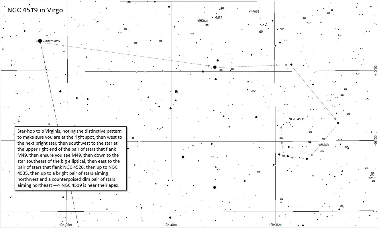 Early in the evening, high clouds drifted around the sky and interfered with the view, during the time when I observed this galaxy. The sky may still have had a touch of twilight when I first began to search for it. After several attempts, I was able to detect this galaxy using averted vision; one of the things I had to do was go from 76x up to 123x and wait for the Moon to be covered by clouds to suppress some of the light pollution. I could not make out any details or structure, just a faint hazy spot in the correct location. |