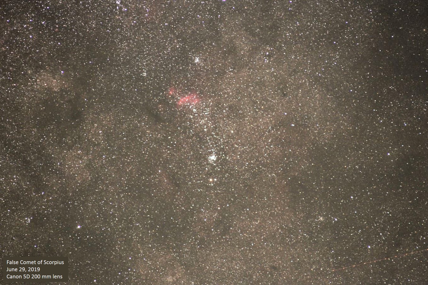 to NGC 6231 and the False Comet at center right. Three distinct areas of red emission